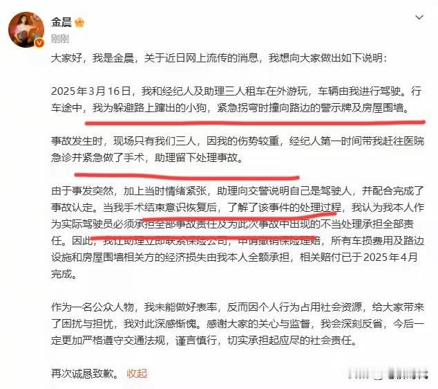 警方通报后金晨晒出受伤照并致歉!看她满脸是血,车撞的只是设施且已赔偿,这算逃逸吗?原来是为躲避路上蹿出的小狗,一个紧急拐弯撞向路边的警示牌及房屋围墙。 2025年3月16日那天,三人租了车在外游玩,车辆由金晨进行驾驶。 事故现场只有他们三人,因她伤势较重赶往医院,助理留下处理事故。她人受伤了,提前离开了去了医院也没什么问题。 金晨是因事故受伤住院,不是故意逃逸。助理主动承担事故责任人。她或许不知情。 事后金晨能主动出面承担事故责任,做出赔偿和补救措施, 说实在话,她这一段说辞,听起来合情合理。 如果是这样,说明她做的没错啊,本来可以混过去了,人家自己主动承担责任了,再说了,她是撞了墙,不是撞人,也不是逃逸吧。 出现交通事故尤其是这种单方面交通事故,可以先打电话报警,然后说驾驶员受伤,需要先去医院,留下助理在现场处理。 相信警方的调查结果,不要因为金晨是公众人物就放大事件。