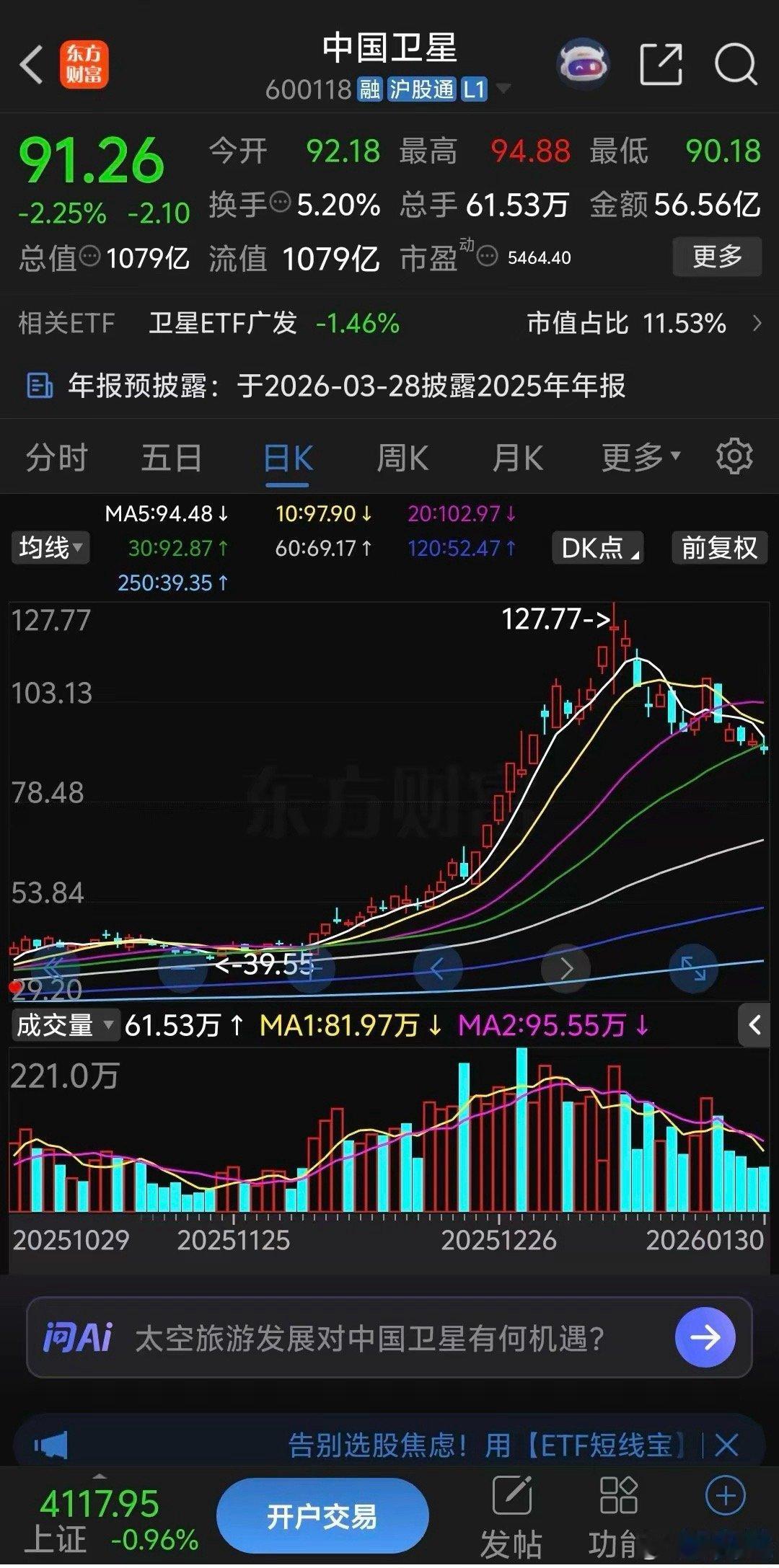 中国卫星跌的太惨了,早盘低开1.26%后抄底资金涌入迅速拉升反弹,但是今天涨幅并不高,不到2%就冲高回落快速跳水,反弹高度刚好到5日均线,之后的每次反弹一波比一波低,尾盘恐慌盘割肉越来越多,收盘暴跌2.25%跌破30日均线,今天成交量仍然没有放大跟昨天差不多,股民越来越谨慎,经过这波下跌后山顶成交了上千亿资金无法解套,感觉进一步走弱的概率仍然相当大,追高股民惨不忍睹。