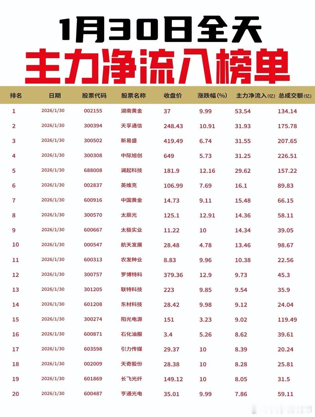 【1月30日全天主力净流入流出榜单出炉🔥】: 今日主力资金流向呈现显著的结构性切换。资金从昨日表现强势的有色金属板块大规模撤离,并重新回流至AI算力及黄金等方向。