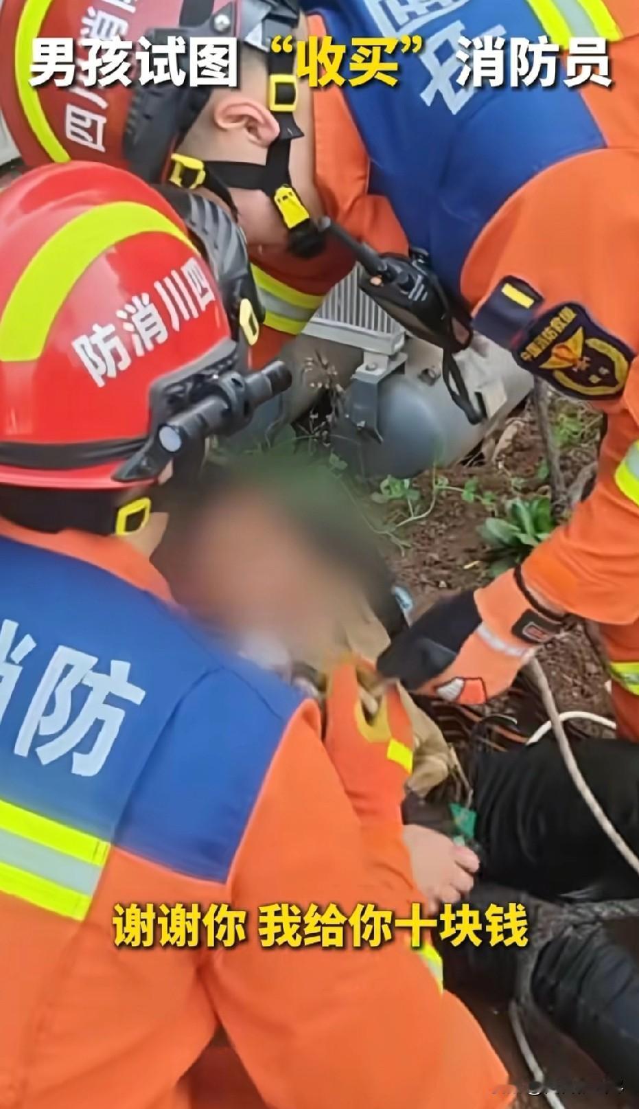 “笑不活了!”近日,四川资阳男童玩耍时不慎坠入深井,获救后第一反应太真实:不要跟我家长讲,见消防员没有答应,男童试图收买消防员说谢谢你,我给你10块钱。网友:消防员确实没跟你家长说,但全国都知道了! 1月27日,四川资阳发生了一件又惊险又好笑的事,一名男童在玩耍时不慎坠入数米深的施工井坑,等到消防员把他成功救出,孩子的第一反应不是哭也不是怕,反倒急着跟消防员“求情”,还掏出10块钱想“封口”,这一幕被记录下来后,迅速在网上传开。 当天,这名男童和小伙伴们趁着寒假有空,跑到一处未完工的施工区域玩耍,那里遗留着一个没有防护措施的井坑,孩子玩得兴起时没注意脚下,一不小心就掉了进去。 井坑有好几米深,里面残留着少量积水,男童坠落后全身都湿透了,手臂还轻微擦伤,但意识一直保持清醒。 周围的小伙伴吓得赶紧呼救,路过的居民听到后立刻拨打了救援电话,当地消防、派出所和社区工作人员很快就赶到了现场。 救援人员到场后,立刻展开处置,先确认了男童的安全状况,随后迅速搭建救援设备,用绳索缓缓下放,小心翼翼地靠近井底。 男童在井底虽然有些害怕,但看到消防员叔叔的身影,还是努力配合着救援动作。经过十几分钟的紧张救援,男童被成功拉上井口, 刚一落地,还没来得及拍掉身上的泥土,就迫不及待地拉着消防员的衣角,小声恳求不要跟自己的家长讲这件事。 消防员看着孩子认真的模样,忍着笑意耐心安抚,并没有直接答应。 没想到男童见求情没用,立刻从口袋里掏出皱巴巴的10块钱,硬是要塞给消防员,一边递钱一边反复说着感谢的话,那架势仿佛在进行一场严肃的“交易”,希望能用这10块钱让消防员叔叔保守秘密。 在场的救援人员和围观群众都被这天真的举动逗乐了,纷纷拿出手机记录下这有趣的一幕。 随后,男童被送往医院进行全面检查,结果显示除了轻微擦伤外,身体并无大碍。社区工作人员也第一时间联系了男童的家长,家长赶到医院后,虽然对孩子的冒险行为有些生气,但更多的是后怕,也对救援人员的及时救助表达了深深的感谢。 而事发的施工区域,社区已经协调相关方进行了打围处理,设置了明显的警戒线和安全提示,还向周边居民进行了告知,彻底消除了安全隐患。 这段救援视频被发布到网上后,很快就引发了网友们的热烈讨论。有网友调侃道,消防员确实没直接“告状”,但这事儿全国网友都知道了,孩子的小秘密算是彻底藏不住了; 还有网友留言说,这孩子也太真实了,怕被家长批评的样子像极了小时候的自己,10块钱大概是他全部的“家当”,用来收买消防员的样子又可爱又好笑。 也有不少网友借此提醒其他家长,寒假期间一定要加强对孩子的安全教育,远离施工区域、深井等危险场所,避免类似的意外发生。 孩子怕被家长批评的心理虽然天真,却也反映出家庭教育中常见的场景,而消防员的暖心救援和耐心安抚,也让这场惊险的意外多了几分温情。 目前,男童已经平安回家,家长也对他进行了详细的安全教育,相信经过这次经历,孩子会更加重视自身安全。 对此,你们有什么看法,欢迎评论留言~