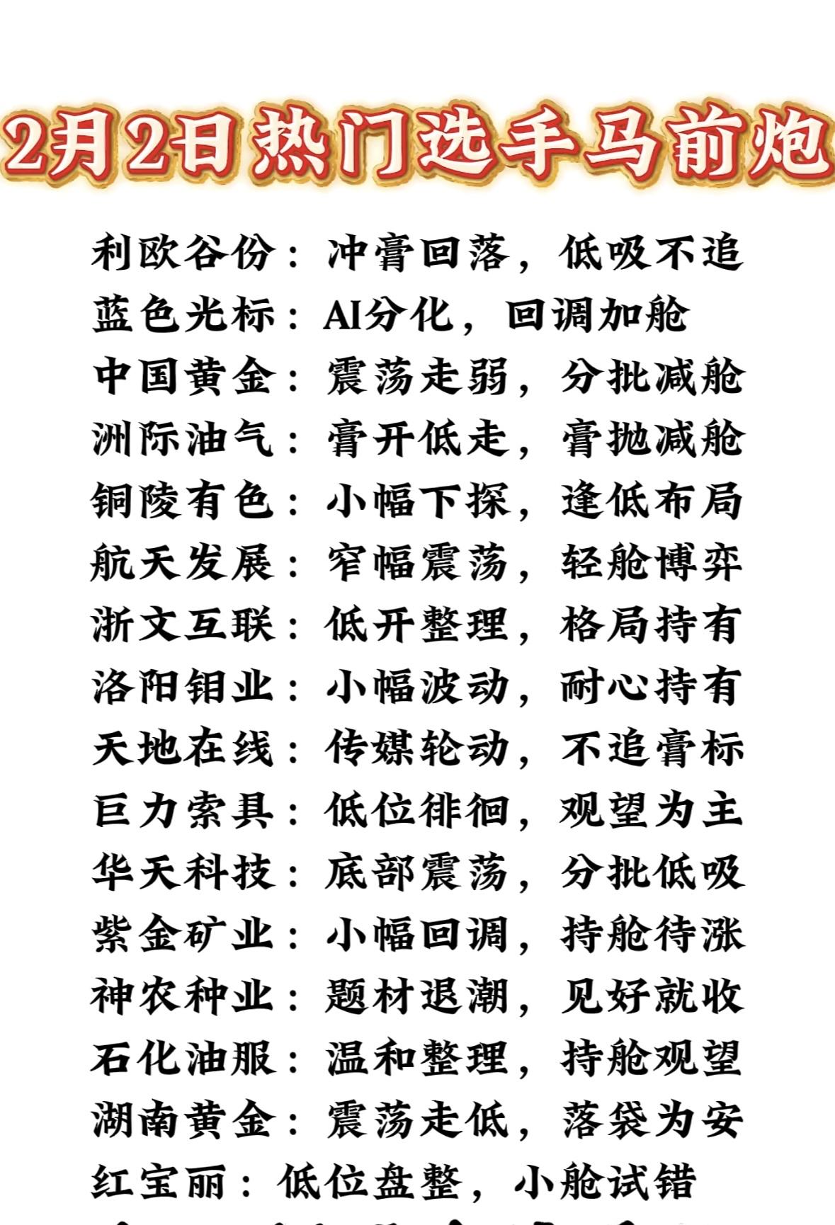 2月2日热门选手马前炮分析 热门选手操作策略:低吸回调股,减仓弱势票,震荡市轻仓博弈,题材退潮及时止盈,底部震荡分批布局,耐心持有待涨。