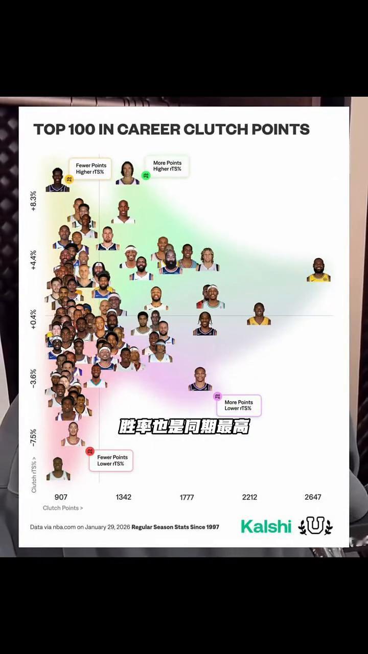关键先生。 硬实力说话,詹姆斯成1996年以来关键时刻得分王,胜率也是历史第一。数据不会骗人,詹姆斯以2865分成为近30个赛季以来关键时刻总得分最多的球员,同时62%的关键时刻胜率也是同期最高,直接把关键先生的标签焊在了身上。 你心中的nba关键先生top3都有谁?