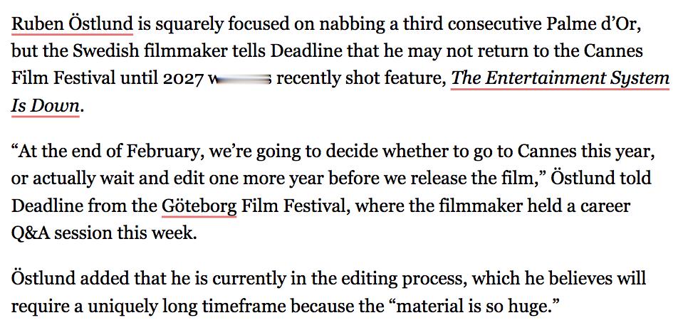 TNABO 鲁本·奥斯特伦德:老夫已经在憧憬把第三座金棕榈捧回家的情形了,不过打算今年参加戛纳的各位同志们莫慌,我的新片貌似一时半会剪不完,这一年可能赶不上了,2027年圆梦也不迟