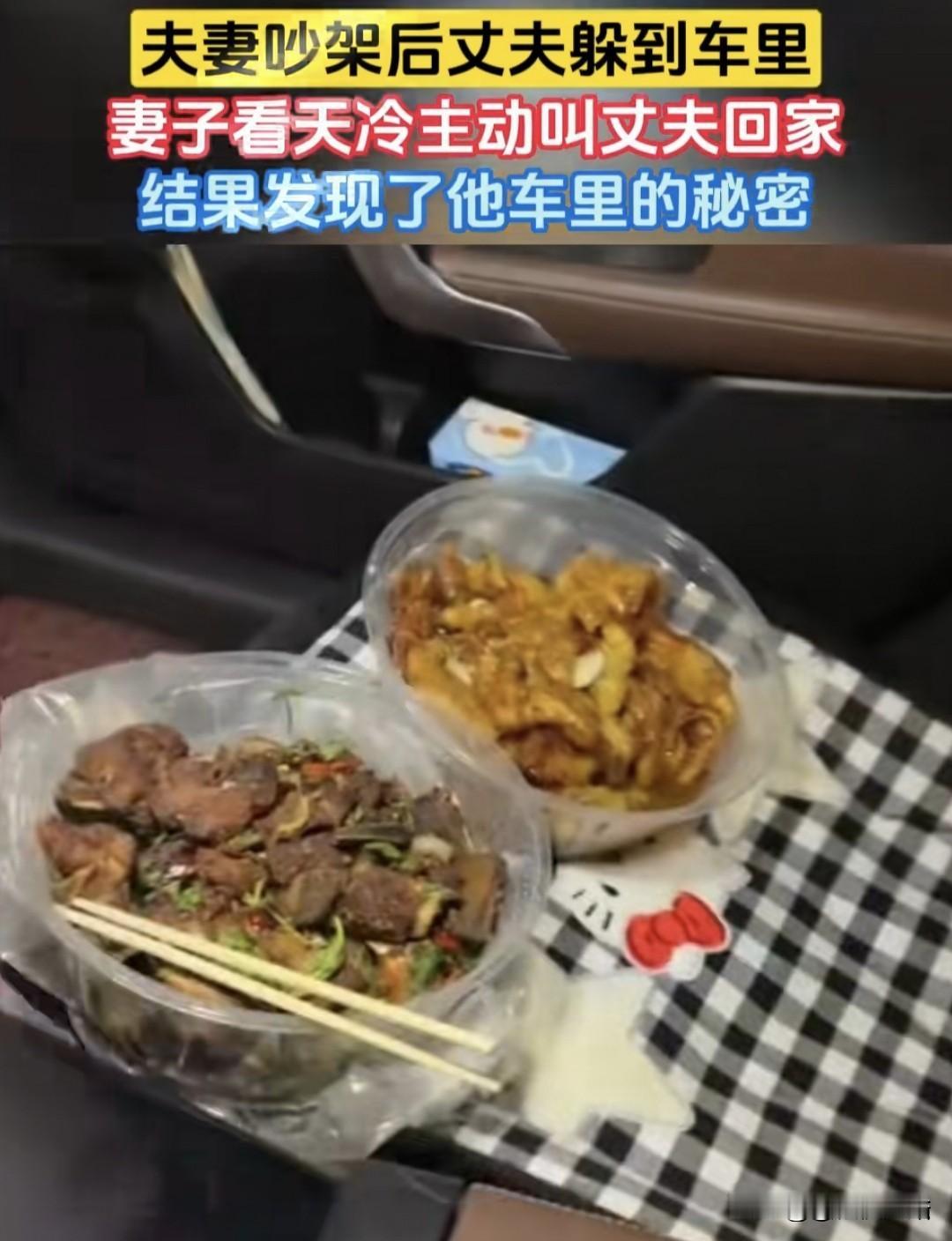 “笑不活了!”晚上,女子和丈夫吵架后,丈夫独自躲进车里,女子担心天冷冻坏他,主动喊他回家,丈夫面无表情直摇头,说啥不回家,女子往车里一看,发现他车里的“秘密”,当场气笑了。网友:吵架归吵架,不能亏待自己。 深夜的小区停车场风很冷,路灯一圈一圈照在地上,车子停得不算多,反而显得空。 妻子裹着外套下楼时,脸上还是那种吵完架之后的别扭:一方面还憋着气,另一方面又担心人真在车里冻着。 他们刚才在家里闹了一通,说到底也不是什么大事,可能就是谁没收拾、谁说话冲、谁觉得自己不被理解。 吵的时候都觉得自己有理,门一摔,人走了,剩下的那个人反而开始后悔:万一他真在外面硬扛,越想越不踏实,她甚至顺手煮了碗热汤面,想着把人叫回去,起码先吃点热的,别在外面折腾。 她走到车边,敲了几下车窗,等了两秒没动静,又敲得更用力一些,车玻璃贴着深色膜,从外面看不清里面,她只能看到驾驶位那边隐约有个影子。 她第一反应还是“他是不是在装睡”“是不是气得不想理人”,话到嘴边又咽回去,语气放软了点,问他要不要回家。 车窗慢慢降下来一条缝,冷风立刻灌进去,丈夫侧过脸,看起来没什么表情,也不说话,只是摇了摇头。 妻子正准备继续劝,下一秒就被一股不太“体面”的味道打断了——不是车里那种闷味,而是很明显的孜然和油炸的香气,像刚从小吃店拎出来的。 她愣了一下,凑近闻了闻,表情开始变,再往里看,丈夫的嘴确实在动,像是在嚼东西,难怪刚才不吭声。 她忍不住把手伸进去摸索,指尖很快碰到两个还带点余温的餐盒,边上还有饮料瓶,塑料袋里窸窸窣窣响。 那一刻她的情绪直接翻转:刚才一路脑补的“他在外面受委屈”“冻得不行”全都变成了笑话。 更让人好笑的是,她伸手去拉车门的时候,他下意识把餐盒往里挪了挪,动作特别快,像怕人抢走一样。 那种“我不回家我还要坚持”的姿态,配上“但我先把吃的护住”,一下就把冷战的严肃感,拆得干干净净,妻子站在车外,端着那碗热汤面,脸上是又气又想笑的表情,像在说:你倒是挺会过。 丈夫这时候也装不下去了,被当场抓包之后,继续摆脸色反而尴尬,他停了两秒,像是给自己找个台阶,掀开盒盖,递了一块炸酥肉出来。 热气混着油香冒出来,特别扎眼,妻子本来想硬气一下,但站在冷风里折腾半天,胃也空着,最后还是接过来咬了一口——酥脆的外皮一碎,刚才那点“谁对谁错”的较劲,就没那么重要了。 两个人隔着半开的车窗,你一块我一块,把原本打算“自己在车里吃完”的外卖分掉了,面条也没白煮,后来索性带回去当宵夜。 吵架这件事没有被彻底“讲清楚”,但气氛明显软了下来:至少人没继续硬扛着冷着,面子也都找到了一个不那么难看的收场方式。 这种场景被网友当成段子传开,其实并不稀奇,很多夫妻冷战最怕的是升级成断联、赌气、谁也不回头,那种才真正伤人。 像这种嘴上还别扭、行动上先把自己照顾好,最后用一口热的、香的东西把僵局打散,反而更像真实生活:情绪可以缓一缓,但饭总得吃,日子总得过。 所谓“离家出走”,最后变成了停车场里的一顿外卖野餐,说荒唐也荒唐,说有效也确实有效。