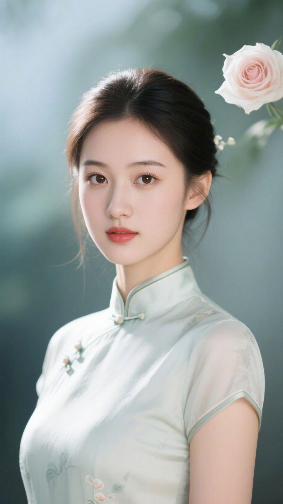 可以再微调得更自然舒展些: 青衫栖春 像掬一捧晨雾里的浅绿,裁作她身上的衫。 纱面浸着软润的光,盘扣是沾了露的玉,襟边绣的花,是刚被风轻碰过的白。发间垂几缕碎丝,衬得颈间漫着自然的温软。侧旁粉玫瑰探来,瓣尖的白与衫色相融,恰是春意落在眉眼。 她抬眸时,无艳色衬,是青纱裹藏的温婉,像旧瓷瓶里盈着的云。从不是张扬的美,是晨雾里漫开的轻柔,连光影落肩袖的痕迹,都软得似化不开的春。 原来中式之柔从非堆砌,不过一抹色、几针绣,便把春日的轻,缝进了衣襟的褶皱里。 青衫春韵 中式温婉风