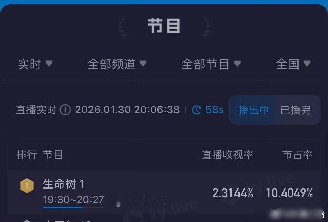杨紫真剧花,生命树开播实时收视率2.3,登顶了!开局6广,很不错!