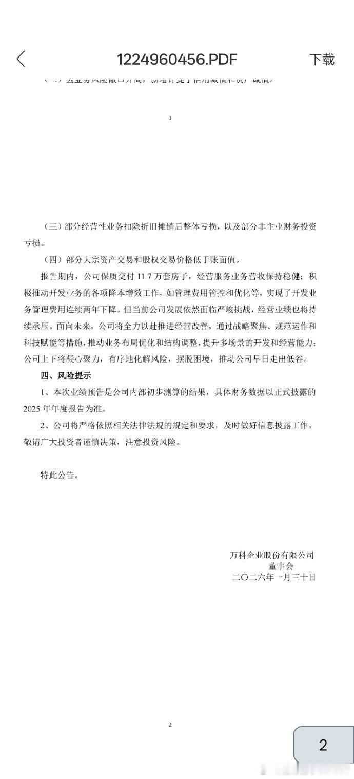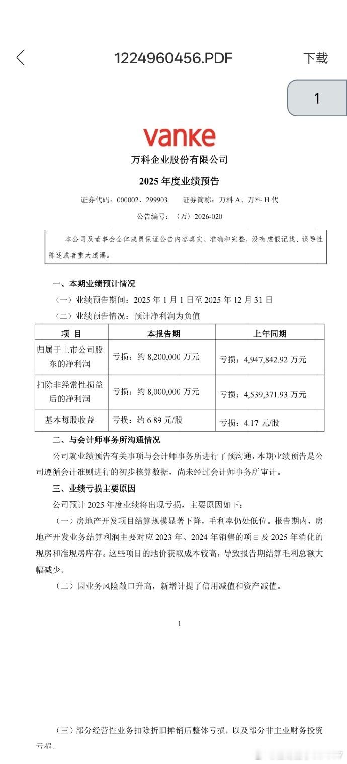 【万科2025年预亏820亿】1月30日,万科A公告,预计2025年归属于上市公