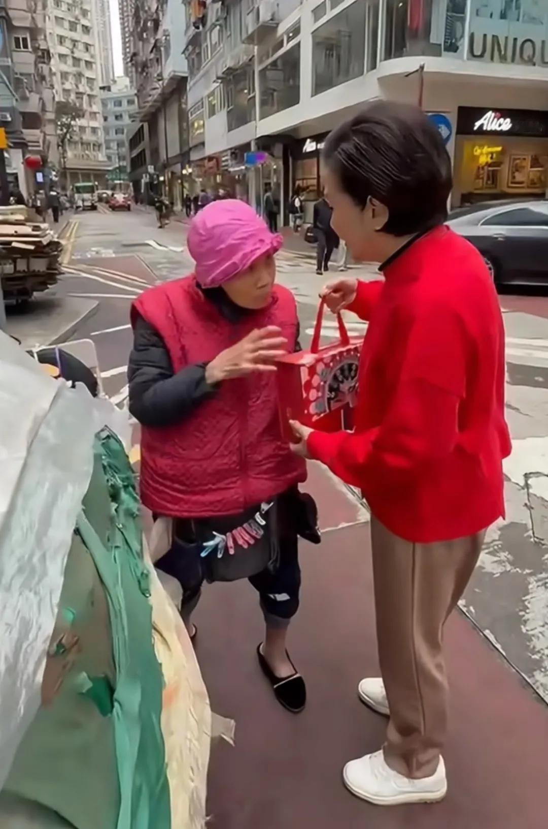 汪明荃连续多年给贫困老奶奶送春节礼物,实在太有爱了! 近日,某网友上分享了在铜锣湾街头偶遇汪明荃行善的视频。 曝光的画面中,一身红衣的汪明荃,拿着包装精致的春节礼盒,来到街上给一名年迈的老奶奶送礼,她还亲切地喊对方“玉姐”,看得出来双方很熟悉。 据了解,这位老奶奶已经摆摊很多年了,汪明荃见她生活贫困,经常光顾她的摊位,还连续多年在春节前后给她送礼物,有时候是萝卜糕,有时候是红包。 不得不说,汪明荃真的太有爱了,难怪能火这么多年。