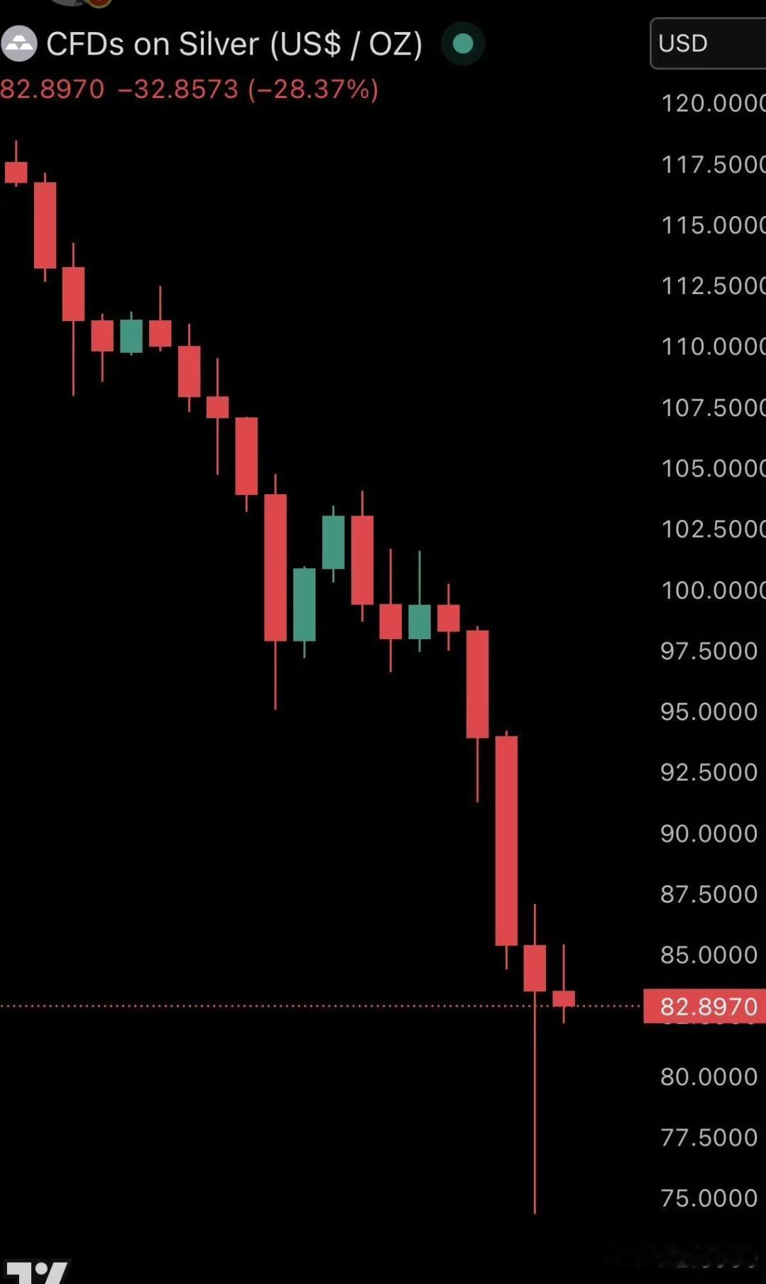 🔻现货白银暴跌,跌幅高达-35%,最低跌破 75 美元/盎司,有望创下 46 年来最大单日跌幅纪录。 🔻此前在旺盛需求和投机推动下曾出现抛物线式上涨,一度触及每盎司 120 美元,然后在获利了结、美元走强以及交易过热后的市场回调诱因下逼近自 1980 年以来最大的单日跌幅。 🔻这个就叫多空双杀。