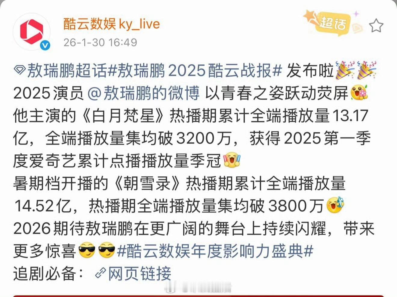 敖瑞鹏酷云战报敖瑞鹏2025酷云高光时刻来啦,白月梵星和朝雪录里的精彩表现让人印象深刻,上升期潜力巨大的95🥜。