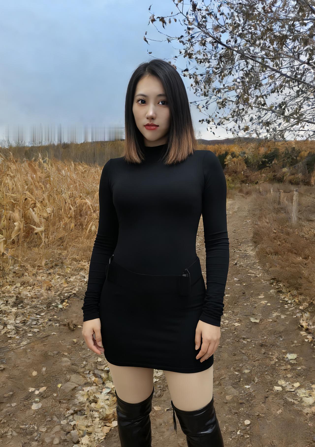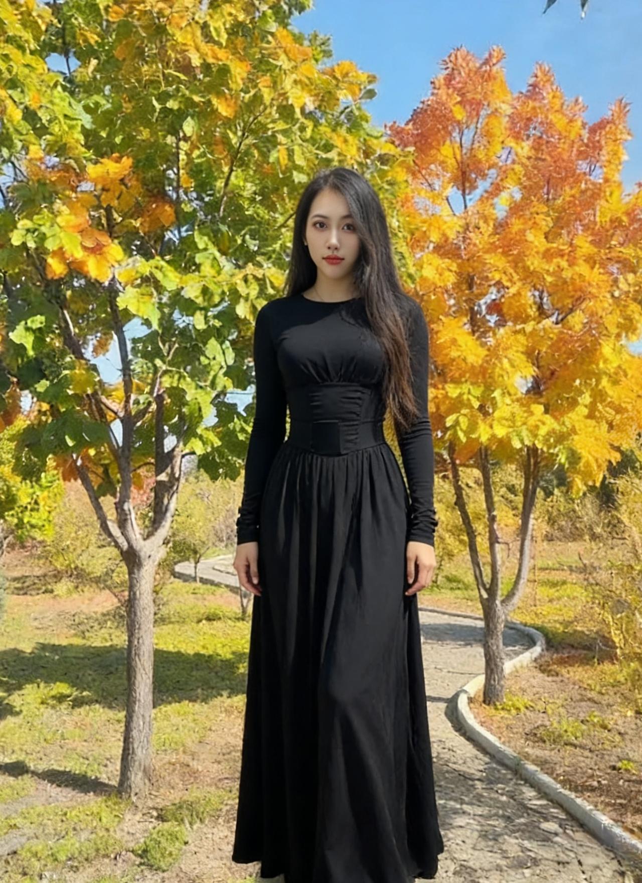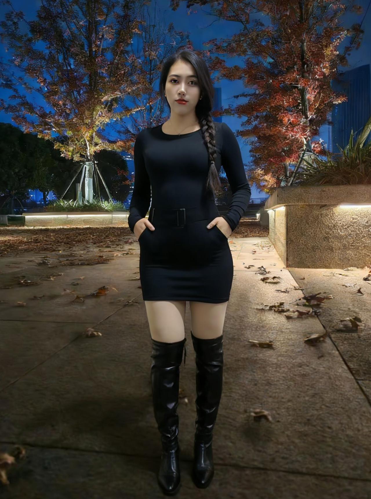 她把夜色裁成贴身的裙 秋风掠过玉米田时 裙角便有了金色的褶皱 ~ 正午的阳光穿过枯藤架 在她垂落的长发上跳荡 像一群不肯安静的星子 ~ 长靴敲着石板路 每一步都踩碎落叶的私语 身后是燃烧的红枫林 ~ 她站在明暗交界的地方 左手是城市的灯火 右手是郊野的风声 ~ 睫毛上沾着微凉的露水 红唇轻启时 有整座秋天的呼吸