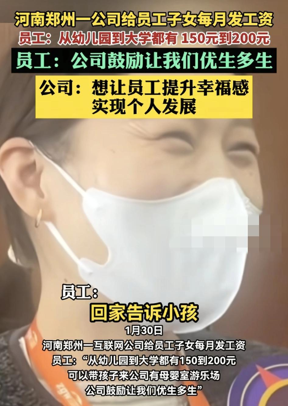 河南郑州一家互联网公司每一个月会给员工的子女发放工资,家长称,孩子们听到自己有工资都非常的高兴。据说公司就是让员工可以不断提升幸福感,鼓励多生优生。从孩子幼儿园一直到大学,每个月都会发放150元到200元不等。公司鼓励个人与公司共同发展,达到双赢。平时家长可以带孩子来到公司的母婴游乐场,一边上班,孩子也可以放心的玩。