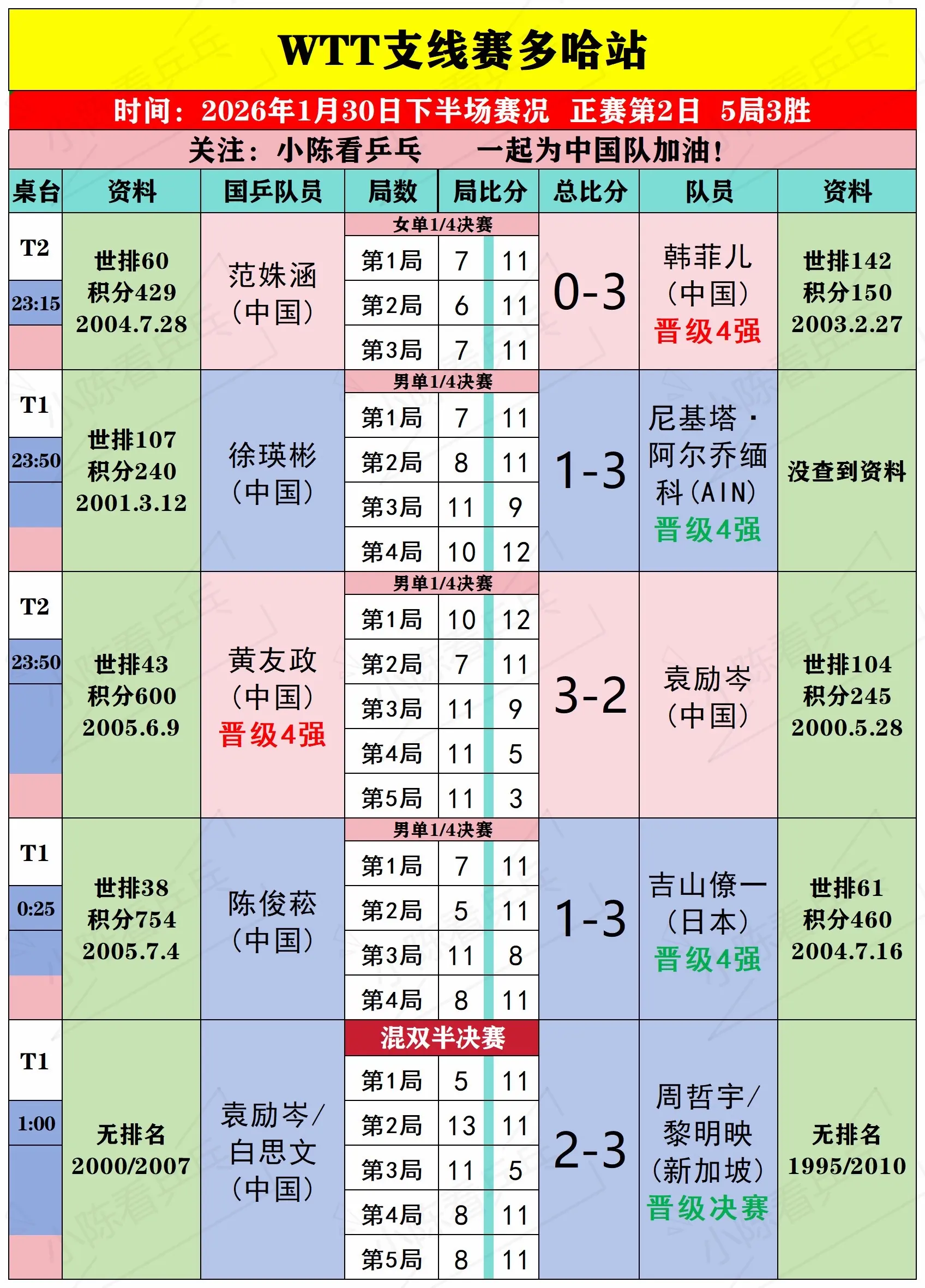 WTT多哈支线赛1月30日上半场赛况。WTT多哈支线赛1月30日上半场...