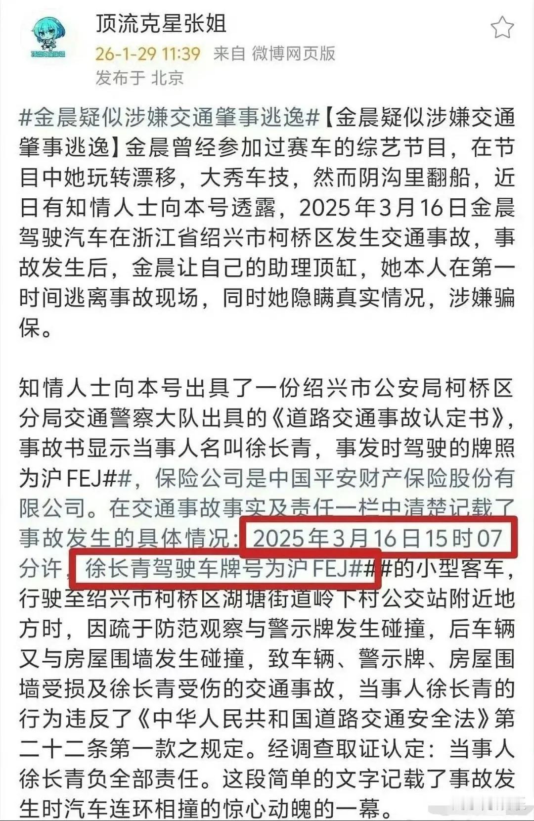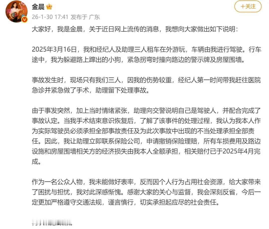 交通肇事逃逸 结合警方通报与金晨本人声明,核心事实与行为动机、酒驾疑云的关键信息如下: 一、核心事实(官方通报) 2025年3月16日,金晨在浙江某地驾车避让窜行犬只,引发单车事故,致车辆、路牌、围墙受损,车内3人轻微伤,金晨脸部受伤。为何要自己开车?自己驾驶水平很高吗?为何不是助理开车?看见狗子横行,就惊慌失措,明显是驾驭不了这辆大G嘛。不应该是稳住方向盘踩刹车吗?不过压死了也是没办法,尽全力了嘛。 金晨因伤赴上海就医,助理徐某青留守报警,却向交警谎称自己是驾驶员,交警按简易程序处理;事后未理赔,无骗保事实。 金晨术后让助理撤销保险理赔,全额承担所有损失,并公开道歉。 二、疑点分析 1.先按照没有毒驾或者酒驾作为前提条件来分析,驾驶过程中突发状况(如狗子横行),致车辆失控发生事故。凡是正常人就是报警,报保险,等待交警到现场开事故处理单,然后走保险程序,完全没问题。 2.如果金晨需要紧急就医(哪怕是去上海就医),先行离开也没问题,交警现场勘验后,事后传唤出事故处理单也应该是可以的。这种情况下,交警肯定会怀疑酒驾或者毒驾,这个时候驾驶人必须自证清白。 3.助理谎称是驾驶人,有两种情况,一种是自发行为,金晨是知名演员,助理想要护主或者救主,要减少影响。还有一种情况就是受组织的指使或者授意,这种情况就值得考量了,为什么呢?出于什么目的呢?有必要吗?又没撞死人! 4.难道动机真的是减少影响避免舆论吗?是多一事不如少一事吗? 三、行为动机分析(这是豆包给我分析的,不代表本人的观点) 1.核心直接动机:就医避险 脸部受伤(含网传鼻修复术后伤口问题,问题是系保险带了吗?),急于就诊是首要原因,且安排人员留守报警,与“为逃避法律追究而逃离”的肇事逃逸构成要件不符。 助理顶包的关键变量 金晨称术后才知助理顶包,随即纠正并担责;若属实则无“指使顶包”的主观故意。 若后续查实其知情或指使,将面临行政处罚(罚款、拘留),但因事故未达刑事立案标准,不涉刑责。 2.其他可能动机 艺人身份顾虑:担心事故与伤情影响事业与形象,优先就医止损。 现场处置失当:事发突然、团队应急能力不足,导致程序违规。 三、酒驾疑云澄清 警方通报明确事发当日三人未就餐,无饮酒场景,排除酒驾可能。那毒驾的可能能排除吗?无任何官方信息指向毒驾或无证驾驶。 四、法律定性要点 1.单方事故、仅轻微伤与一般财产损失,不构成交通肇事罪。 2.离开现场系就医所需且有人留守处置,不构成法律意义上的肇事逃逸。 顶包行为若涉指使,按《道路交通安全法》《治安管理处罚法》予以行政处罚;未涉骗保,不涉刑事包庇罪。 总结一句话,事出非常必有妖。整件事情的处理,不是正常人的做法。这么大的明星也应该不会在乎要那点保险费。毫无必要的情况下,让助理顶包,违反常人逻辑,不可思议。背后一定有原因,或许只有他们自己知道,还有天知道!