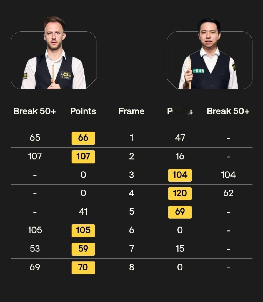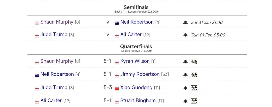 德国大师赛,“80三虎”的舞台! 1月31日清晨,斯诺克德国大师赛1/4决赛烟消云散! 肖恩·墨菲5-1凯伦·威尔逊 阿里·卡特5-1斯图尔特·宾汉姆 尼尔·罗伯逊5-1吉米·罗伯逊 贾德·特鲁姆普5-3肖国栋 80三虎在1/4决赛的逆天数据: 贾德·特鲁姆普,两杆破百三杆50+,三连鞭; 尼尔·罗伯逊,一杆破百一杆50+,三连鞭: 肖恩·墨菲,一杆破百四杆50+,四连鞭! 半决赛赛程,11局6胜赛制: 21点: 肖恩·墨菲vs尼尔·罗伯逊 2月1日3点: 贾德·特鲁姆普vs阿里·卡特