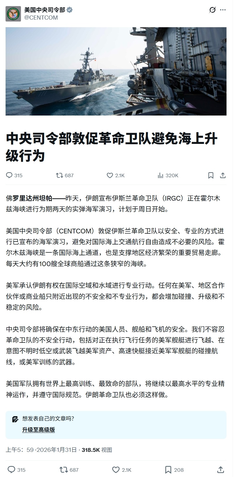 美国中央司令部发文表示,伊朗称将从1月31号开始在霍尔木兹海峡举行为期两天的海军实弹演习,美国中央司令部敦促伊朗以安全、专业的方式进行。烽火问鼎计划热点观点