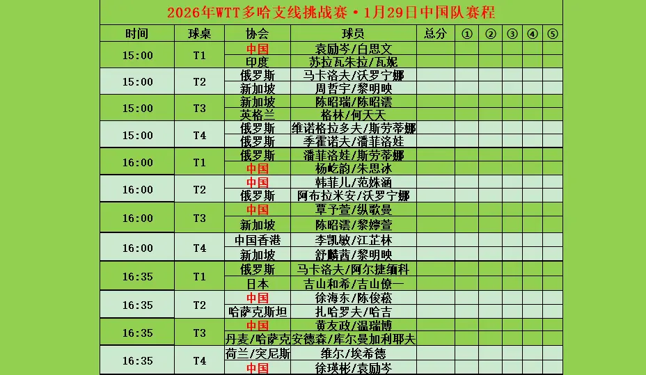 WTT多哈支线赛1月29日赛果。WTT多哈支线赛1月29日中国队赛果及1月30日完整赛程