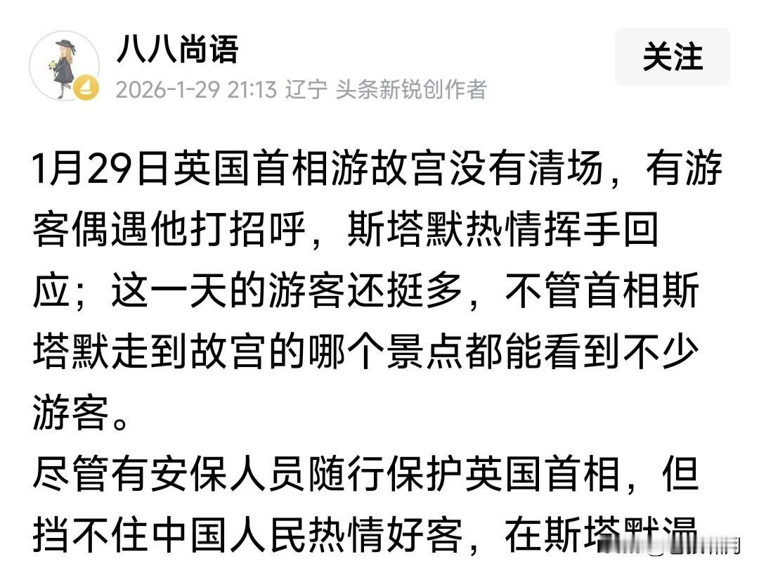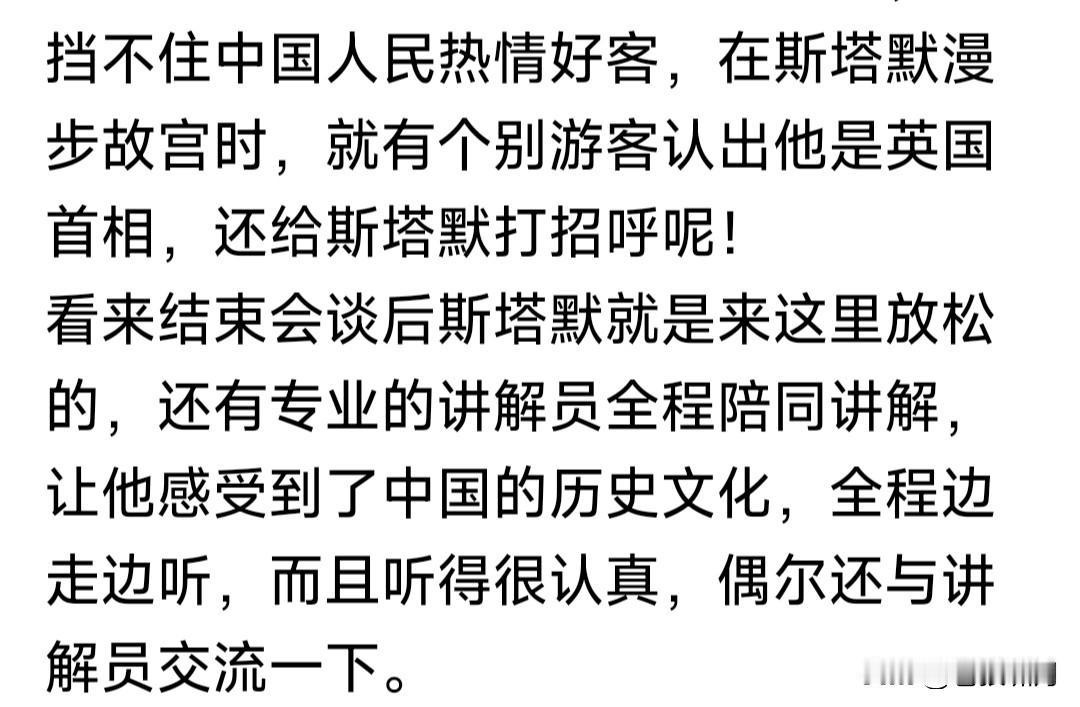 斯塔默游故宫,游人络绎不绝。有人认出英国首相,互相打招呼问好!看样子没清场,彰显改开自信好环境! 这是他上任以来首次访华,目的是为中英合作发展注入活力。据悉英方最近批准中国大使馆新址申请,让这项拖了8年的计划项目,终于尘埃落定。 当然英方也得到回报,据悉英国医药巨头“阿斯利康”,将在中国投资150亿,用于医药科研生产。此举互利共赢,英国得实惠,激发中国医药研发。 中英加大经贸合作是好事,会引领中欧经贸合作新发展。这是特朗普关税战的“负效应”,对于中欧与世界却是“正能量”。各国和谐发展才能共赢! …………