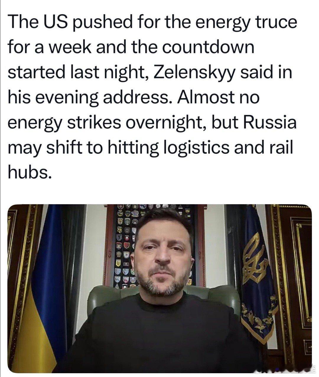 Zelensky:俄罗斯应美国要求,停止攻击能源设施一周(因为天气太冷)….但是,俄军可能转为炸交通运输系统