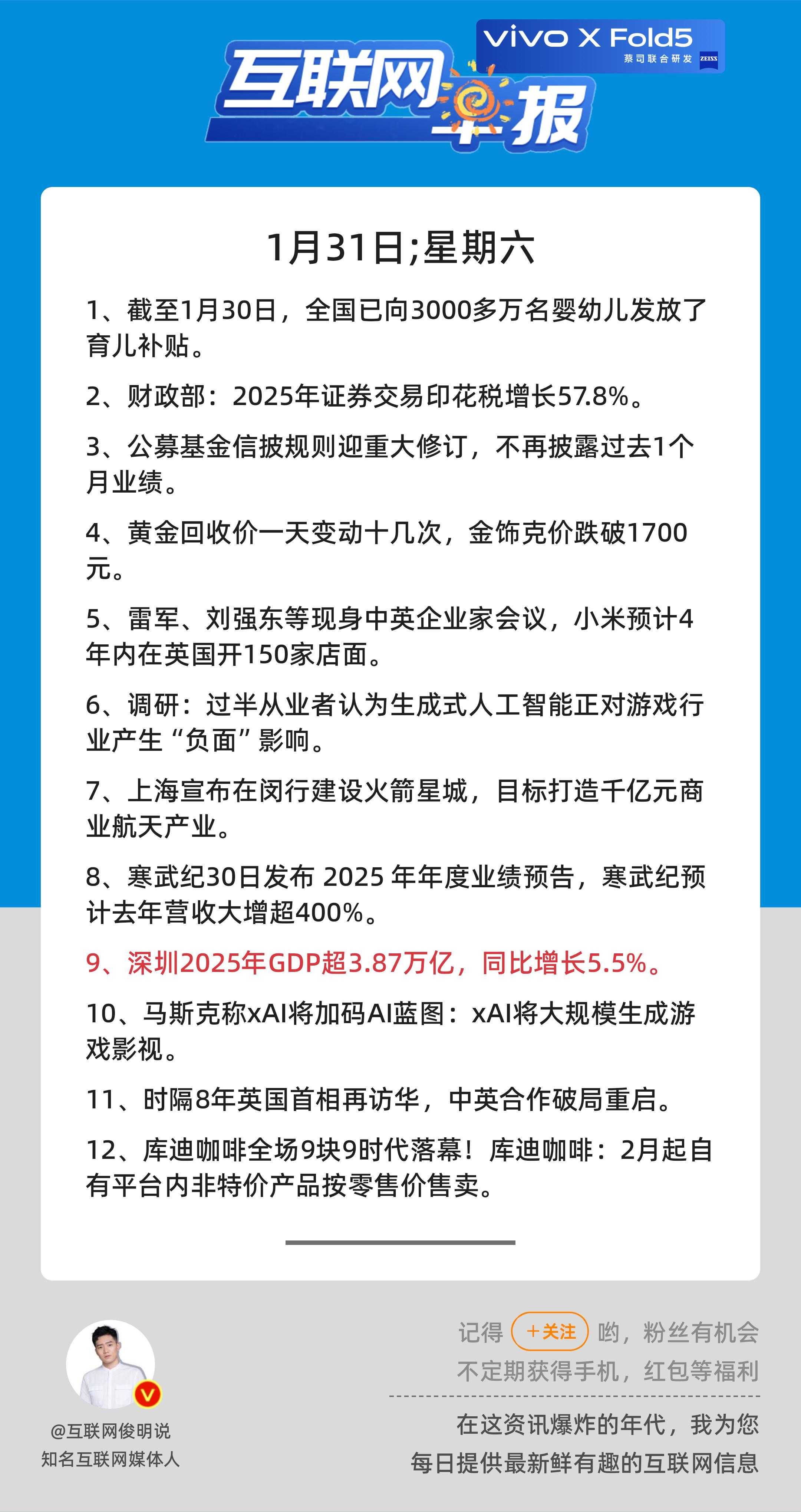 1月31日,星期六,《第3035期》;互联网早报,众览天下事关心第9条:深圳2025年GDP超3.87万亿,同比增长5.5%;早安————————————点击右上方关注每天一分钟众览天下事,互联网早报值得拥有! 更多精彩,欢迎加入粉丝群俊明和他的朋友们