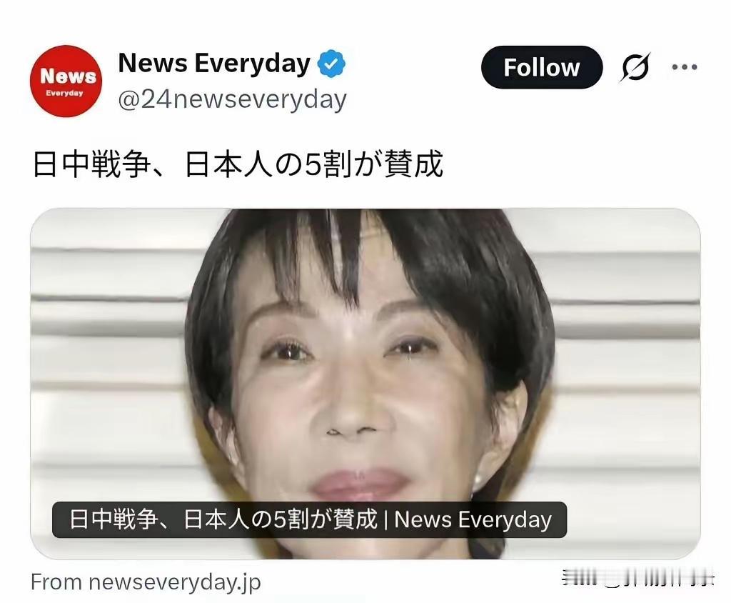 看到这个消息第一感觉是日中战争,五成本子人赞成开战,小本子这是要疯了么? 第二感觉是搜搜这个News Everyday是个什么媒体,消息真实不真实,结果显示是家日本不入流的网络平台媒体。 第三感觉五成本子人赞成对中开战,可见小本子是多么的狂妄的!在中日实力差距巨大的背景下,小本子顶着二战战败国的身份,还敢有如此对中战争冒险想法,小本子是多么的是狂妄的!必须不得不防!