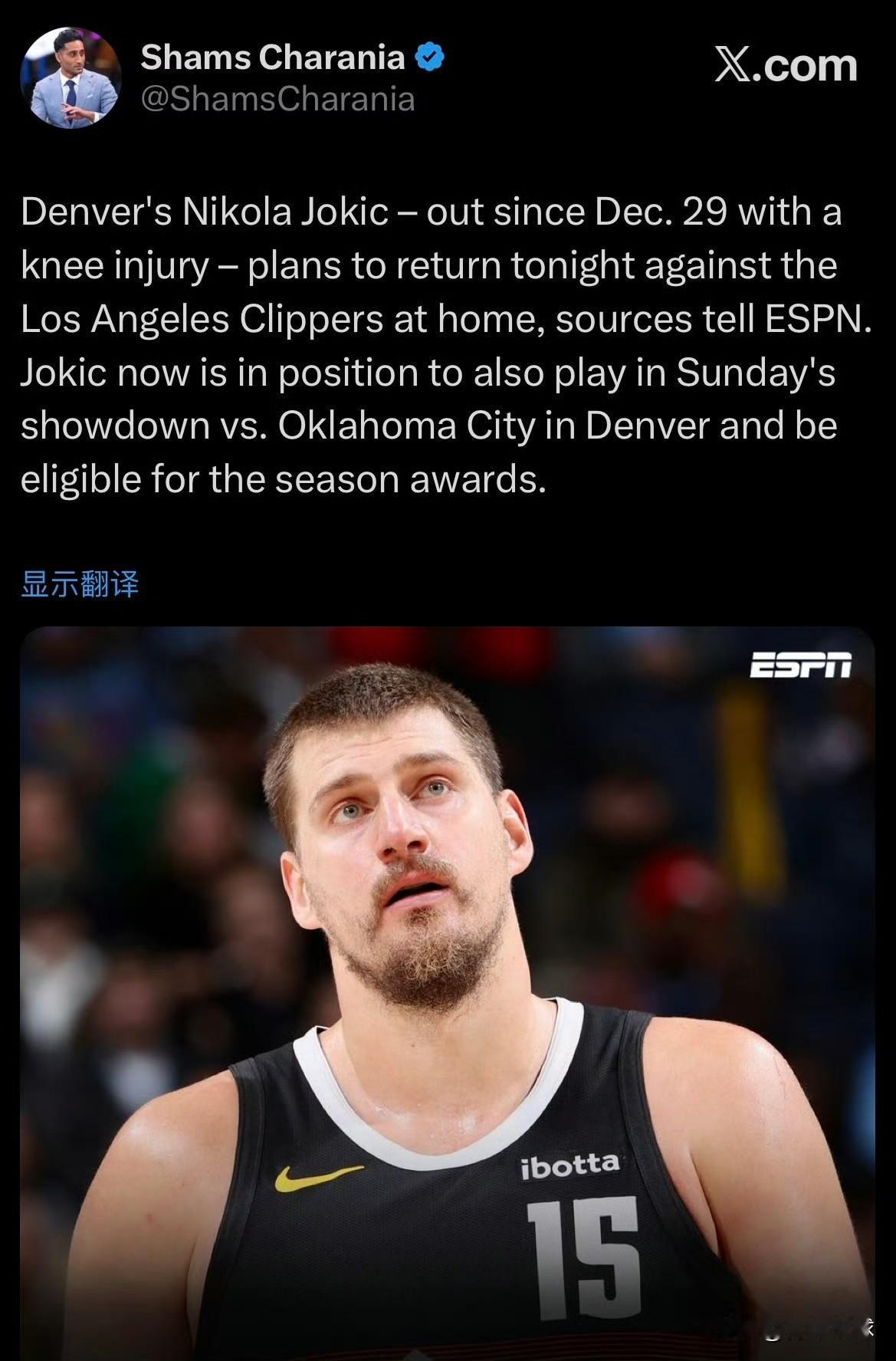 再拼一拼MVP!约基奇今日对阵快船复出! 据权威记者Shams报道:掘金队当家球星约基奇将于今天对阵快船队的比赛中迎来复出。 在去年12月底遭遇了膝盖过度伸展后,约基奇已经缺席了16场比赛,再缺席2场就将失去评选MVP的资格。看来约基奇还不想就这样放弃MVP的评选,由于受伤,他已经从MVP排行榜榜首跌至第三,这已经是他本赛季的最低排名了。只要约基奇复出后再能打出之前那样出色、全面、有统治力的表现,且保证打够65场比赛,那他依旧是MVP的最有力争夺者,没有之一。