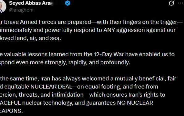 “手指已扣在扳机上” 伊朗回应特朗普威胁! 美伊这俩“冤家”又杠上了,局势紧张得让人心都揪起来了! 1月28日,特朗普在Truth Social放狠话,说庞大的美国舰队正驶向伊朗,还威胁伊朗不谈核计划就可能遭受比去年更惨烈的袭击,那口气嚣张得不行,仿佛伊朗已经是砧板上的鱼肉,任他拿捏。这哪是谈判的态度,分明就是赤裸裸的恐吓! 伊朗也不是吃素的,外长阿拉格齐直接硬刚回去。他在X上霸气回应:“我们勇敢的武装部队已准备就绪,手指已扣在扳机上,将对任何侵略立即且强力回击!”这话说得那叫一个解气,让咱看到了伊朗捍卫国家主权和尊严的坚定决心。 同时,阿拉格齐也表示,伊朗欢迎公平公正的核协议,但前提是平等、无胁迫,这又展现了伊朗的理性与克制。 哈梅内伊的政治顾问沙姆哈尼更狠,直接警告美国,所谓“有限打击”是幻觉,伊朗会把任何军事行动视为战争开始,要全面反击,还点名要打击特拉维夫心脏地带。这可不是说说而已,伊朗有这样的实力和底气。 美国国务卿鲁比奥还在一旁煽风点火,说伊朗领导层处于最脆弱时刻,经济崩溃是抗议根源。德国领导人默茨也跟着瞎起哄,预测伊朗“日子屈指可数”,政府可能数周内失控。他们这是想通过舆论施压,逼伊朗就范,可伊朗哪会轻易屈服? 回顾去年,以色列与伊朗打仗时,美国就对伊朗核设施动手;伊朗国内货币崩盘抗议时,特朗普又几次释放干预信号。美国这不断挑衅的行径,就是中东局势紧张的罪魁祸首。 美伊之间的矛盾,根源在于美国长期以来的霸权主义和单边主义。美国为了自身利益,随意对他国进行制裁、威胁甚至军事打击,完全不顾国际规则和他国感受。伊朗为了维护自身安全和发展权益,不得不强硬回应。 这场冲突,受伤的最终还是普通民众。战争带来的只有破坏、死亡和痛苦,没有真正的赢家。希望美国能收起那套霸权做派,坐下来和伊朗好好谈,通过和平、对话的方式解决分歧。也希望国际社会能发挥积极作用,推动美伊走向和平,让中东这片土地早日恢复安宁。家人们,你们说是不是这个理儿?