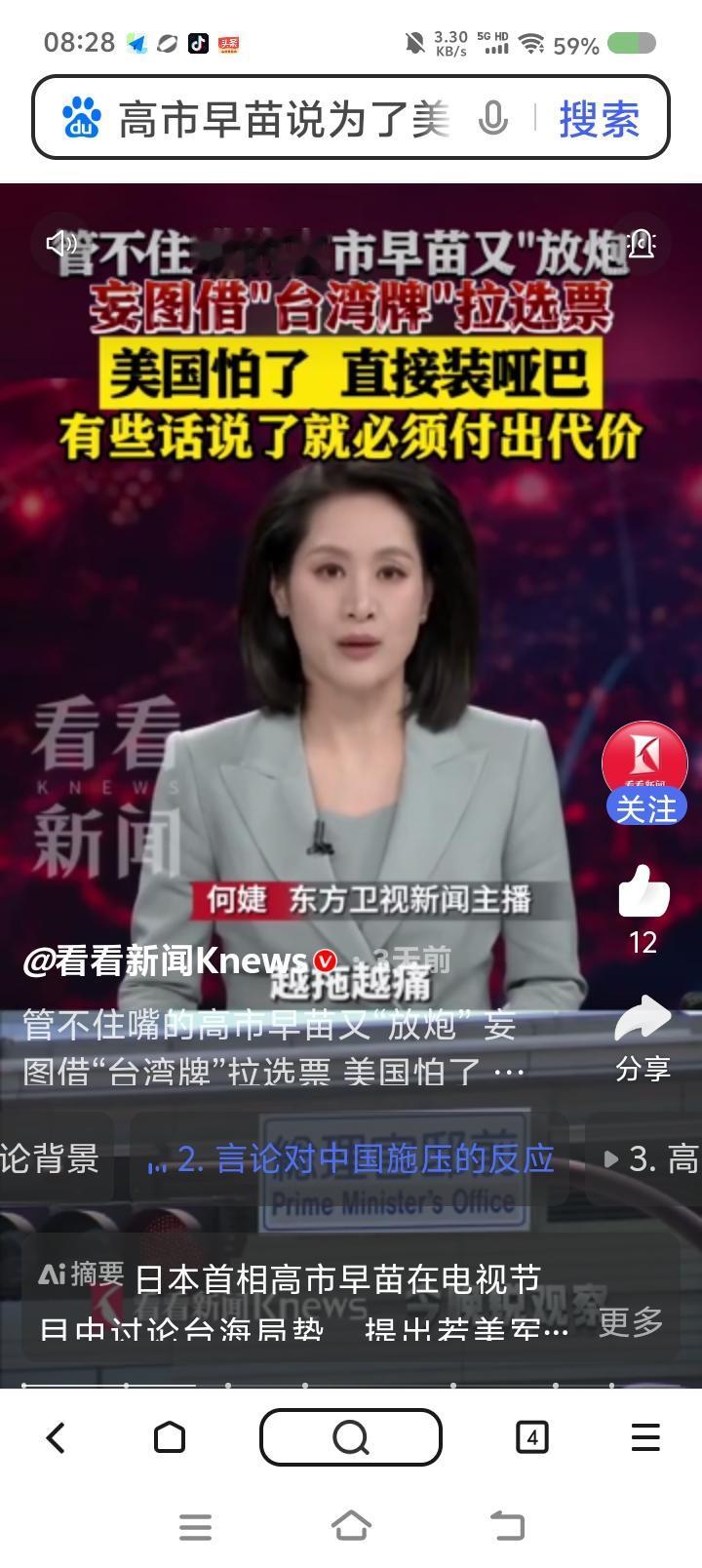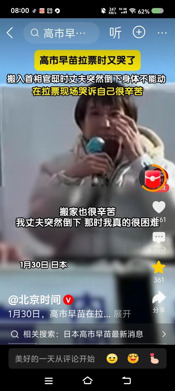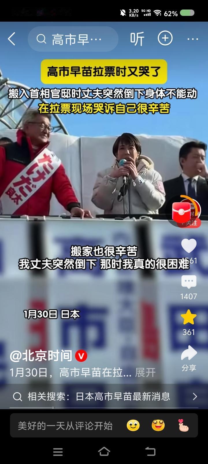 高市早苗又哭了?—— 据报道,高市早苗街头拉票,又哭了:“搬入首相官邸时丈夫突然倒下,身体不能动,那时真得很辛苦,搬家也很辛苦……” 点评: 一、台湾省的介文汲说:“高市早苗解散众议院,扬言再投票自民党票数要过半,意味着要增加34席,这么容易吗?她不哭行吗?她会一路哭,选举失败了她下台时还得哭! 经济不好,选举又要花600亿日币,老百姓早厌烦了!天天没事干了? 很多议员本来还有几年的工作机会,你重新选很可能选不上了,尤其是第一次当选的人,连任机会低。再说,那34票很可能把维新会的票抢了,他们都是极右翼,执政联盟不稳固了。 至于政治主张,荒唐!声称要‘抗中保日’,历史上中国对日本不友好吗?” 二、近期,高市早苗又扬言:“如果美国在台海遭受中国攻击,日本不出手,那日美同盟会瓦解……” 日本这是铁了心要拉它干爹陪葬了! 特朗普这会不蹦了,装聋作哑了。