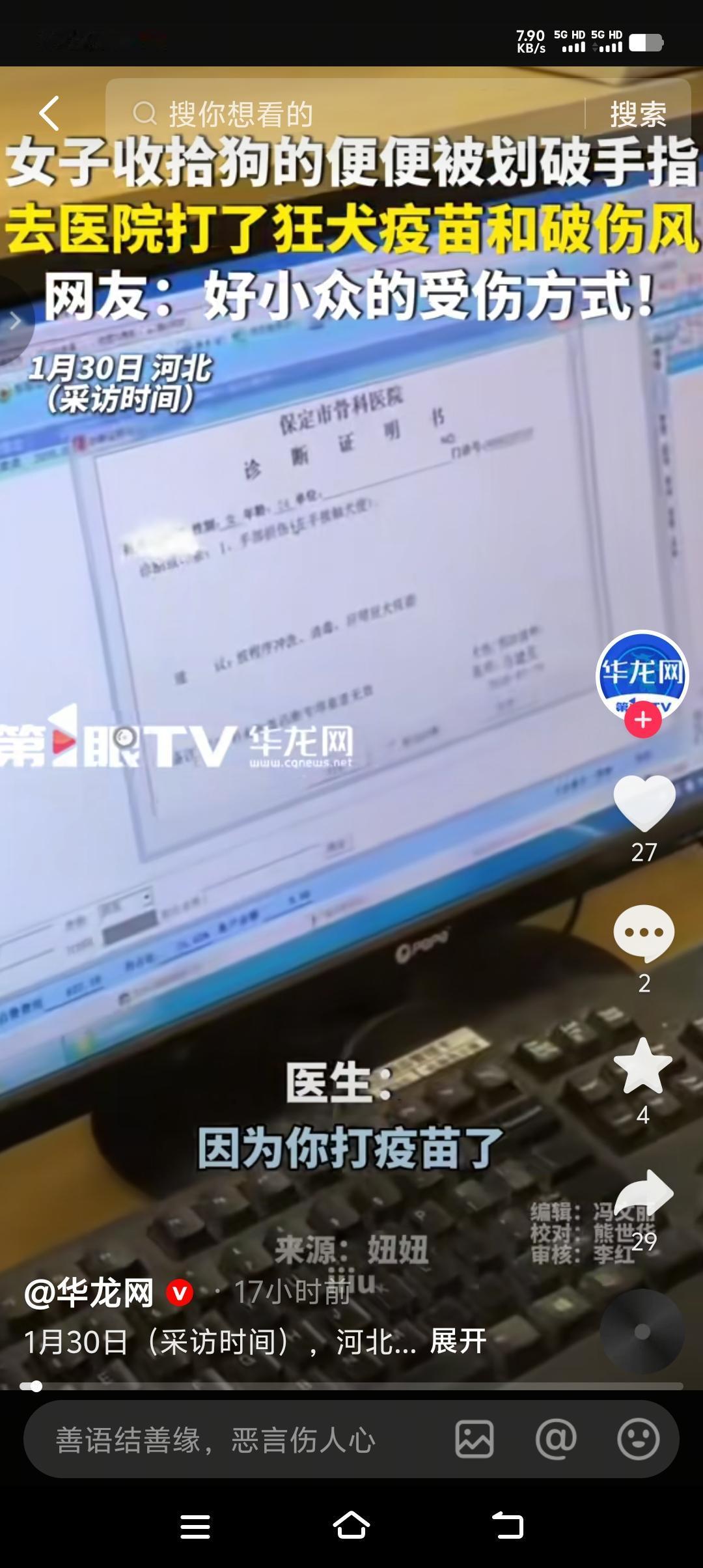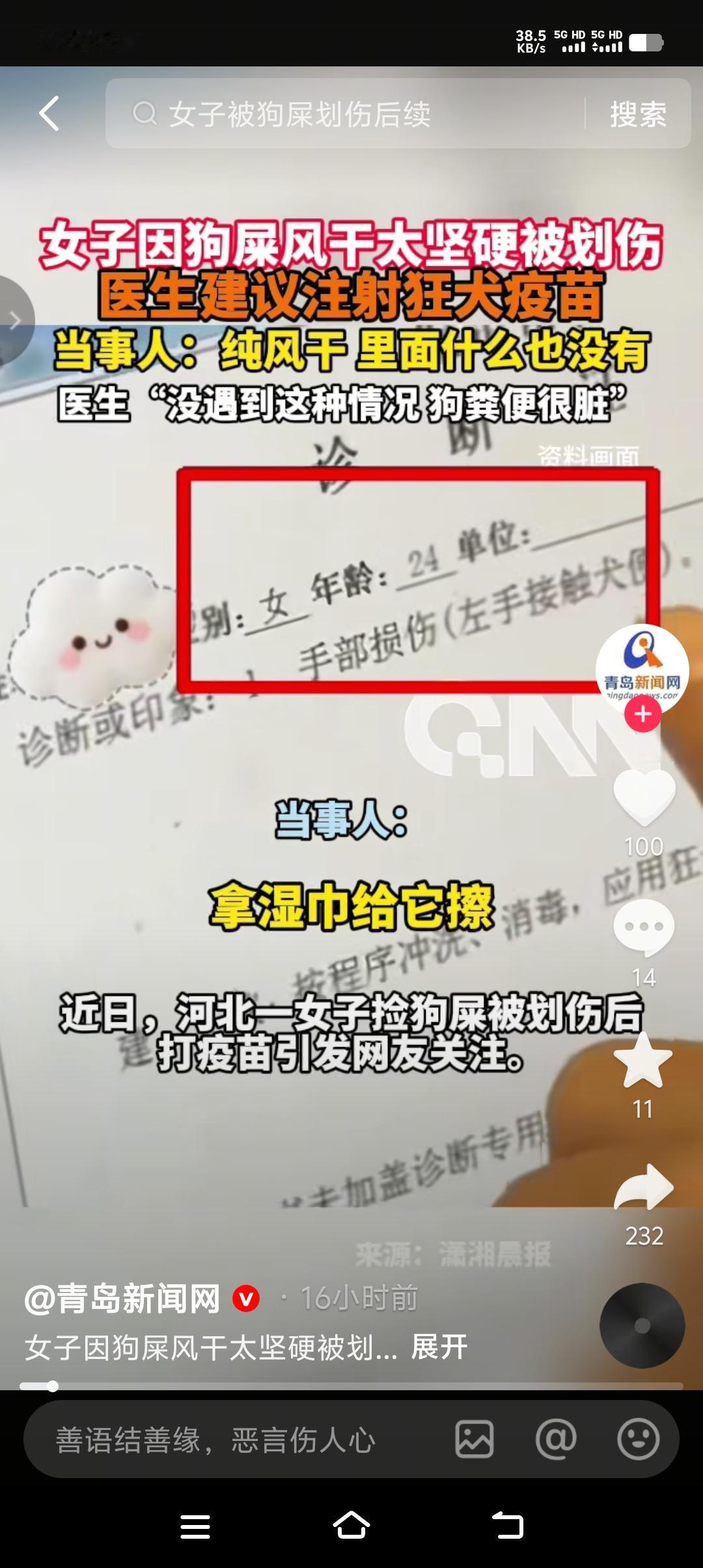 见过被猫狗抓伤、咬伤打狂犬疫苗的,没见过被狗粪便划伤打狂犬疫苗的,真是世界之大无奇不有。 第一怪,捡狗屎能被狗屎划伤,怎么捡的? 第二怪,狗屎能把人手划伤,风干的狗屎有这么锋利吗? 第三怪,这也是最怪的,医生居然建议打狂犬疫苗。 第四怪,24岁的李女士居然打了狂犬疫苗和破伤风。 如果换作你,你会打狂犬疫苗吗?欢迎评论区留言。