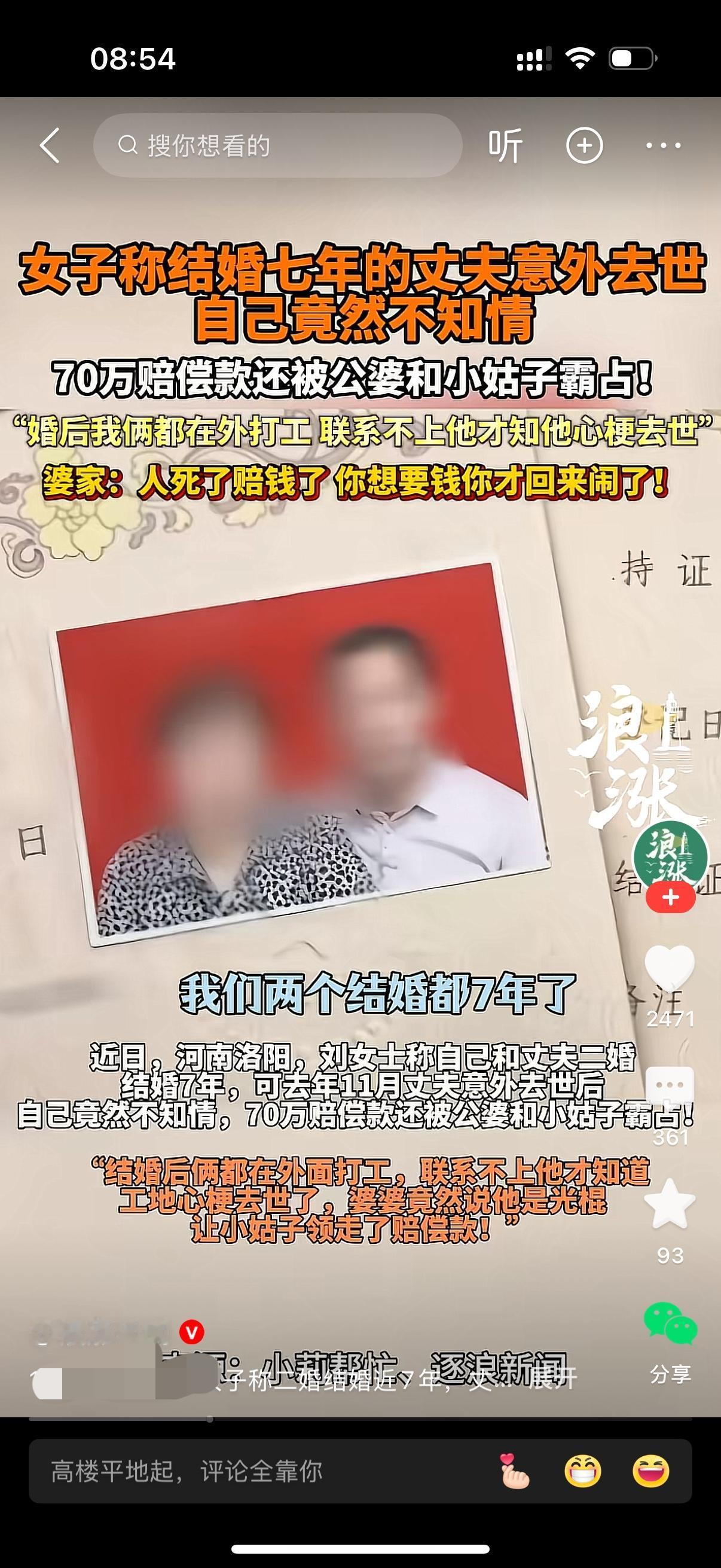 女子结婚七年的丈夫意外去世,自己竟然毫不知情。70万的赔偿款还被公婆和小姑子霸占。婚后女子和老公都在外地打工,长期异地。女子联系不上丈夫才知道男人在工地上发生心梗去世。公婆说,女人平时对男人不管不顾,结婚7年从来没有回家过年,她们的婚姻名存实亡。现在人死了赔钱了,你想要钱才回来闹了。哎,这样的婚姻真是悲哀。