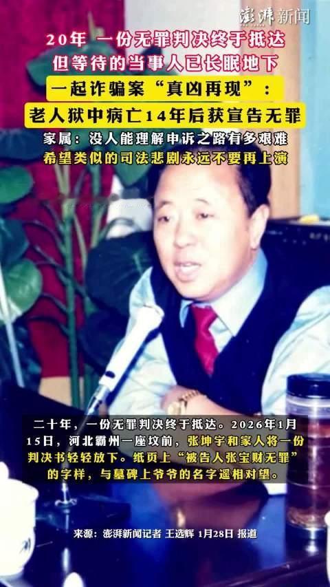 17 岁少年弃梦学法,20 年为病逝爷爷洗冤:骨灰旁的无罪判决书,是迟到的正义 2007 年,河北霸州商人张宝财的人生骤然崩塌。一纸 “合同诈骗罪” 判决书,将他钉上 14 年刑期的枷锁。面对指控,他一遍遍喊冤,坚称涉案钱款早已交给上线 “孙双”,可警方出具的 “查无此人” 证明,成了击碎他所有希望的最后一击。 狱中岁月,张宝财的身体被绝望拖垮。2012 年,他带着满腹冤屈病逝,没能等到洗刷清白的那天。彼时,17 岁的孙子张坤宇,在爷爷的灵前立下誓言:“我要学法,为您翻案。” 这个少年收起了年少的懵懂与憧憬,将复仇与昭雪的执念,化作寒窗苦读的动力。他埋头书山题海,以优异成绩考入 211 院校,又一路披荆斩棘,叩开中国政法大学研究生的校门。 校园里的每一个深夜,图书馆的每一盏台灯下,张坤宇都在与泛黄的案卷、晦涩的法条较劲。他循着爷爷口中 “孙双” 的线索,不放过任何一个蛛丝马迹,在浩如烟海的司法文书里抽丝剥茧。功夫不负有心人,他终于锁定关键证据 —— 一份判决书中,真凶孙玉飞的曾用名一栏,赫然写着 “孙双”。 真相的曙光,终于穿透了近 20 年的阴霾。2026 年 1 月,法院再审改判,张宝财无罪。当那份迟来的判决书被轻轻放在张宝财的骨灰盒旁,仿佛是逝者终于听见了世间的公道回响。 这场跨越两代人的洗冤之路,让无数网友泪目。“正义会迟到但不会缺席” 的感慨背后,是一个家庭破碎的人生:含冤病逝的商人、耗尽青春的少年、漫长岁月里的煎熬与等待。 这起冤案,更像一面镜子,照见了司法取证疏漏的沉重代价。它让我们看见,一个 “查无此人” 的草率结论,足以毁掉一个人的人生;也让我们看见,司法纠错机制的每一步完善,都承载着普通人对公平正义的期盼。 当张坤宇用十年寒窗换一纸清白,我们感动于少年的执着与担当,更应深思:如何让冤案预防与救济体系更完善,让 “迟到的正义” 少一些,让 “不缺席的正义” 多一些。毕竟,每一个冤案的背后,都是无法重来的人生。