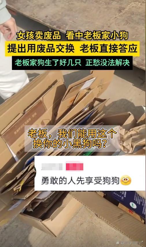 离谱又好暖!合肥女生3元纸箱,从废品站“换”走一只小黑狗 合肥一名女生的一次废品变卖,意外解锁了一场充满缘分的温情奇遇,短短几日走红全网,治愈了无数网友。 女生整理家中杂物后,拎着一摞纸箱前往附近废品站变卖,本以为只是一次普通的交易,却被废品站老板家的一只小黑狗深深吸引。小家伙毛茸茸、怯生生的,围着她不停摇尾,女生一时心动,突发奇想地向老板提出:“我用这些废品,换这只小狗可以吗?” 令她没想到的是,老板几乎没有犹豫,当即爽快答应。事后女生得知,自己的纸箱仅值3元,而老板之所以愿意,是因为自家母狗近期产崽过多,实在无力照料,能遇到真心喜欢小狗的人,在他看来就是难得的缘分。 女生抱着“用3元换来的幸福”晒照分享,这场特殊的“以废易宠”迅速走红。网友纷纷调侃老板“双喜临门,增收又‘裁员’”,打趣小狗“身价虽低,幸福感拉满”。 没有锱铢必较,没有刻意讨好,一场偶然的心动,一次真诚的提议,促成了这段温暖的缘分,也让我们看到,生活中的小确幸,往往藏在这些不期而遇的善意里。