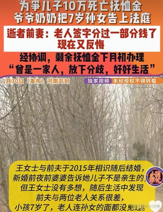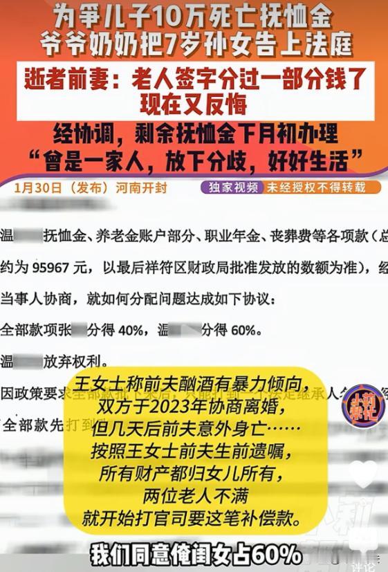河南郑州,王女士与丈夫裸婚,结婚前一晚婆婆告知其丈夫非亲生,让她好好孝顺。8年后两人离婚,5天后前夫去世,留遗嘱女儿满18岁房子过户给她,前夫单位给10万抚恤金,前公婆把7岁孙女告上法庭索要,庭前调解达成协议,前公公放弃权利,前婆婆分60%,孙女分40%,可前公公突然反悔,王女士找记者帮忙,前婆婆说了三件事。 王女士当年那可是铁了心,不顾父母反对就跟丈夫裸婚了。 结婚前一晚,婆婆突然把她拉到一边,跟她说丈夫不是亲生的,还让她好好孝顺,王女士当时也没多想,寻思着都结婚了,就好好过日子呗。 婚后没多久,女儿出生了,本来是件大喜事,可满月宴的时候,公婆不让亲戚来,王女士抱着孩子,看着空荡荡的宴会厅,心里憋屈,感觉自己在亲戚面前丢尽了脸。 这之后,丈夫就像变了个人,开始酗酒,还有暴力倾向,王女士身上经常青一块紫一块的,她想过离婚,可看着年幼的女儿,又狠不下心。 就这么一直熬着,直到2023年,实在忍不下去的王女士和丈夫离了婚,本以为离了婚能松口气,可谁能想到,离婚才5天,前夫就出意外去世了。 前夫还留了遗嘱,说等女儿18岁,房子就过户给她,前夫单位知道这事后,给了10万抚恤金,王女士想着女儿以后用钱的地方多,就把钱存起来准备给女儿。 可前公婆不干了,直接把7岁的孙女告上法庭,要分这笔抚恤金,这事一出,王女士不明白前公婆为什么要这么做。 庭前调解的时候,大家坐在一起商量,最后达成协议,前公公放弃权利,前婆婆分60%,孙女分40%。 王女士觉得这样也算合理,毕竟前公婆年纪大了,就同意了。 可谁能想到,前公公突然反悔了。 王女士当时就懵了,感觉自己被耍了,没办法,只好找记者帮忙。 记者联系上前婆婆后,前婆婆说了三件事。 第一件,前婆婆说儿子生病的时候,他们老两口出了不少钱,所以这抚恤金他们应该多拿。 第二件,说他们年纪大了,身体也不好,以后生活没保障,这钱对他们很重要。 第三件,说孙女还小,以后不一定能孝顺他们,他们拿点钱也是应该的。 王女士听了前婆婆的话反驳说:自己和前夫离婚是因为他酗酒家暴,自己在婚姻里受尽了委屈,而且前夫去世后,自己也没有不管不顾,该做的都做了。 这事,在法律上也是有说法的,先说这庭前调解协议,根据民法典相关规定,调解协议是双方自愿达成的,具有法律效力。 要是前公公想反悔,除非能证明签协议的时候是被胁迫或者有重大误解,不然这协议大概率还是有效的,法律可不会惯着这种不讲信用的行为。 再说这抚恤金的分配,民法典第1127条规定,遗产按照下列顺序继承,第一顺序是配偶、子女、父母。抚恤金虽然不是遗产,但在分配的时候,一般会参照遗产分配的原则。 在这里,前夫去世,王女士和女儿、前公婆都是第一顺序的继承人。 不过,考虑到女儿还小,以后生活和教育都需要钱,在分配的时候应该适当多分,而且前夫留了遗嘱房子给女儿,也能看出他对女儿的关爱,所以抚恤金多给女儿也是合理的。 前公婆说儿子生病他们出了钱,这和抚恤金的分配没有直接关系,抚恤金是对死者家属的精神抚慰和经济补偿,不是对死者生前债务的清偿。 所以,前公婆不能因为给儿子看病出了钱,就要求多分抚恤金。 如今,在利益面前,亲情变得很淡薄,为了钱,可以不顾亲情,甚至对簿公堂。 法院审理后认为,庭前调解协议是双方自愿达成的,合法有效。前公公没有证据证明是被胁迫或者有重大误解,所以反悔无效。考虑到女儿的实际情况,法院最终判决抚恤金按照调解协议的比例分配,前婆婆分60%,孙女分40%。 一部分人觉得前公婆太过分了,孙女还这么小,他们作为爷爷奶奶,不仅不关心孙女的生活,还为了钱和孙女打官司,实在是太不应该了。亲情在利益面前,居然变得如此不堪一击。 还有人觉得,前公婆也有自己的难处,他们年纪大了,没有经济来源,想要分点抚恤金也是情有可原。而且他们觉得王女士可能也有做得不对的地方,不然前公婆不会这么坚决地要分钱。 其实,这件事的关键在于前夫留下的遗嘱。抚恤金和遗产是不同的概念,前夫的遗嘱只涉及房子,并没有涉及抚恤金。所以前公婆有权要求分配抚恤金,但应该按照法律规定来,而不是无理取闹。 不管怎么说,在处理家庭关系的时候,要多考虑亲情,别为了钱伤了和气,也要增强法律意识,知道该怎么维护自己的合法权益。 一家人就应该多一份理解,多一份包容,让亲情在利益面前,依然能坚如磐石。 大家对这事有啥看法,都来说说自己的看法吧。