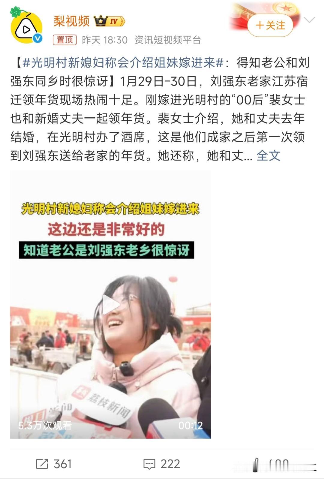 光明村新媳妇称会介绍姐妹嫁进来 1月29日,刘强东为老家宿迁光明村1500户村民发放年货,品类涵盖家电、米面粮油等十余种,覆盖各年龄段需求。 去年10月嫁入该村的21岁00后裴女士,首次以村民身份领取年货,难掩激动,直言现场比网上看到的更热闹,年货实用又暖心。 她与丈夫网上相识,婚前便知晓村里发年货的传统,此次领到心仪的微波炉更是倍感温暖。 裴女士坦言村里氛围友好、福利实在,还打趣称会介绍适婚的姐妹嫁来,而光明村的户口也成了当地让人羡慕的存在。