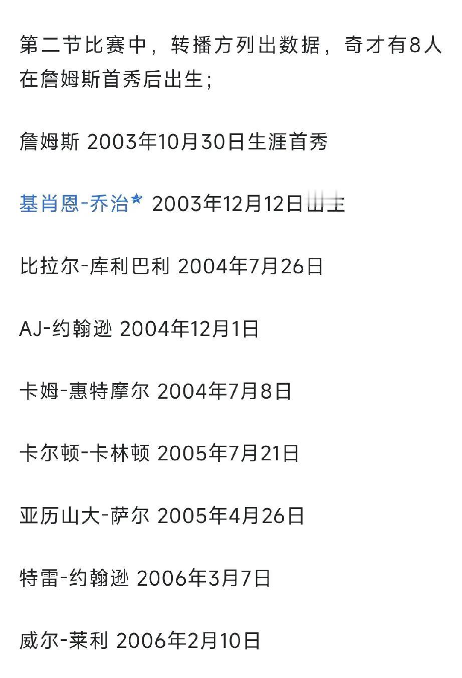 奇才队🈶8人在詹姆斯首秀后出生。太夸张了,更夸张的现在是看着每个回合黑了,联盟历史找不出这个待遇的,黑子根本理解不了职业运动员这种对身体消耗这么大的职业能坚持23年是一种什么样的毅力和自律,最恐怖的是季后赛出场时间,10年9次总决赛消耗这么大,还能这么打,真的是天赋异禀!