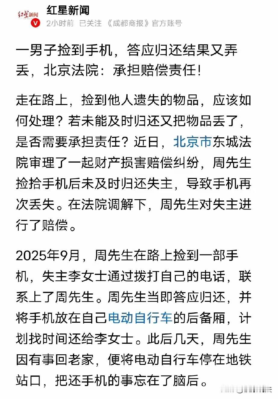 冤不冤?北京,男子捡到一部手机,接到失主的电话,他立马答应归还,之后,把手机放在电动车后备箱,结果有事回了趟老家,几天后,失主联系不上他报了警,男子才想起手机还在电动车后备箱里,停在地铁站口那,等他打开后备箱,发现手机丢了!女子让他赔偿,两人没谈妥,女子一怒之下告上法院,法院判决:赔! 2025年9月份,周先生溜达的时候无意间看到路上有一部手机,他赶紧捡了起来,猜测可能是谁丢的。 他心里既兴奋又有些忐忑——毕竟,手机丢了谁都心疼,尤其是在这个信息发达、每个人都离不开手机的时代。周先生没有犹豫太久,立刻用手机上的“找到主人”功能打了个电话过去。电话那头传来一阵惊喜的声音:“喂,是我!谢谢你啊,真是太感谢了!” 那一刻,他心里暖暖的,觉得自己做了一件善事。于是,他把手机放在了电动车后备箱,打算第二天方便归还。可是,生活总喜欢开玩笑。几天后,他临时回老家,事情繁忙,没想到竟然就把那部手机忘在了电动车的后备箱里。 等他回到城市,想起那部手机时,才发现它还静静地躺在那里。可是,令人震惊的事情发生了——他打开后备箱时,手机不见了!一瞬间,心情变得复杂起来,既有点懊恼,也有点茫然。 失主一听手机丢了,立刻联系了男子,要求赔偿。可是,事情并不像看上去那么简单。男子觉得自己是善意拾得,归还了手机,为什么要赔偿?而失主却坚称“手机值钱,损失你得承担”。双方的矛盾逐渐升级,最终闹到法院。 法院判决结果令人唏嘘:男子应赔偿失主!这起事件,似乎在告诉我们一个道理:善意固然重要,但在现实中,责任和权益也不能被忽视。 这件事让人不禁反思:在这个“利他”与“自我保护”不断碰撞的社会,到底谁才是真正的“冤”呢?是不是每一次善意都应有界限?还是说,我们在追求善的同时,也要学会保护自己?人性中那些复杂的情感,似乎都在这一场看似普通的归还事件中被放大。 更令人深思的是,很多人都曾遇到过类似的困境:你帮了别人一把,结果却变成了“吃亏”;你出于善意伸出援手,却被误解、被指责。善良真的会吃亏吗?还是说,我们的善意需要更智慧的引导? 这起事件的背后,其实折射出社会对“责任”“权益”和“信任”的深层次考量。每个人都希望做好人,但现实往往告诉我们——善意还需要法律和规则的保护。否则,再好的心意,也可能变成“陷阱”。 读到这里,你是否也在心里默默叹气?我们都希望这个社会多一点温暖、多一点理解,但在追求善良的同时,也别忘了保护自己。毕竟,善意不是盲目的付出,而是需要智慧和勇气的平衡。 这场“冤不冤”的争论,还远没有结束。你怎么看?你会为了善意“赔偿”吗?还是觉得,这只是个“人情债”?欢迎在评论区留言,让我们一起探讨这个充满人性与法律角力的复杂话题。毕竟,善良不是盲目,而是有温度的智慧。手机失主 手机丢的心情