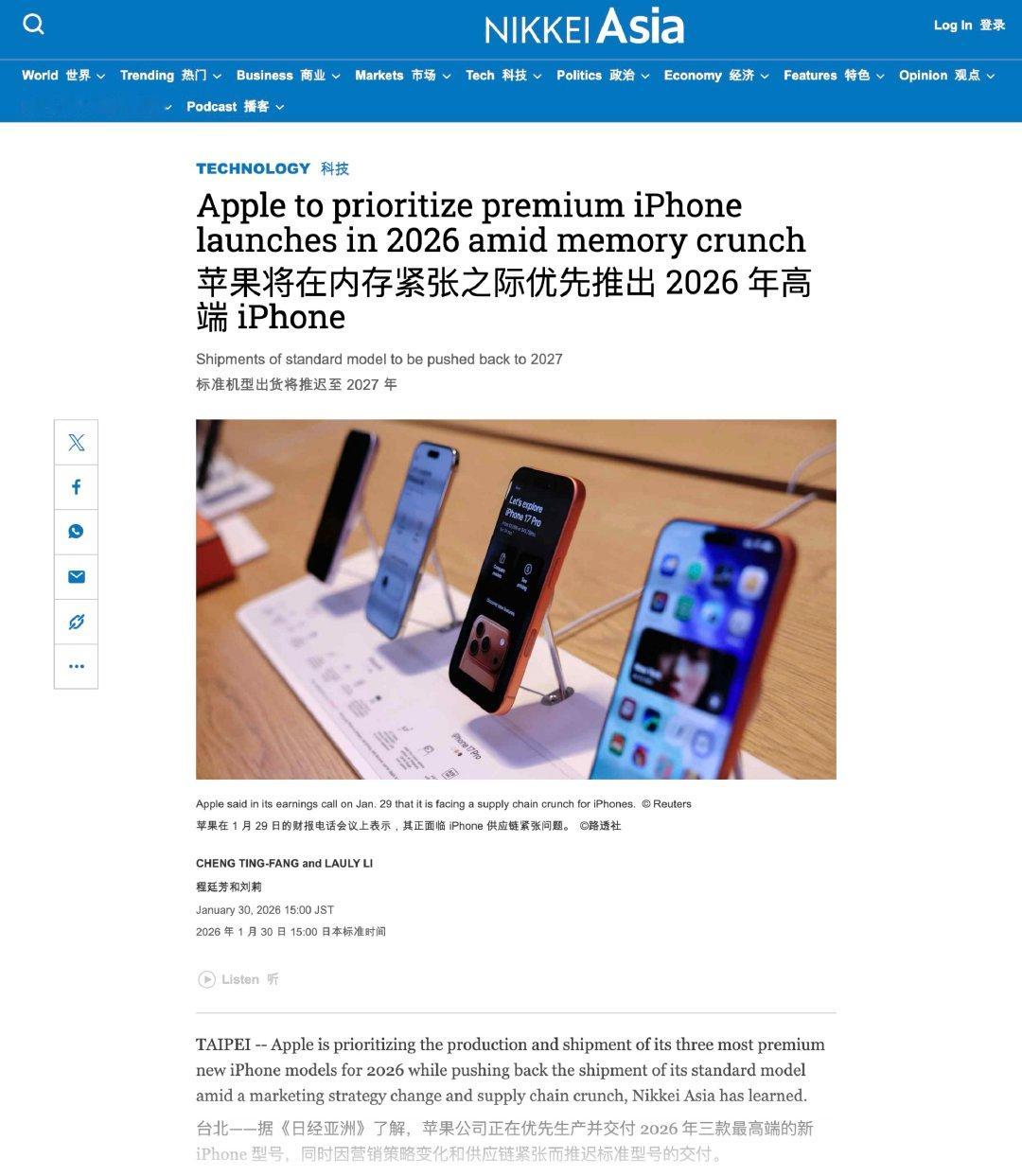 Nikkei Asia 日经亚洲报道,今年秋季发布会只有 iPhone 18 Pro、iPhone 18 Pro Max 和折叠屏 iPhone。iPhone Air 2“今年不会推出”, 可能会和基础版 iPhone 18 一起发布。讲真!iPhone Air 如今这个局面,你说苹果把它砍掉我都信。