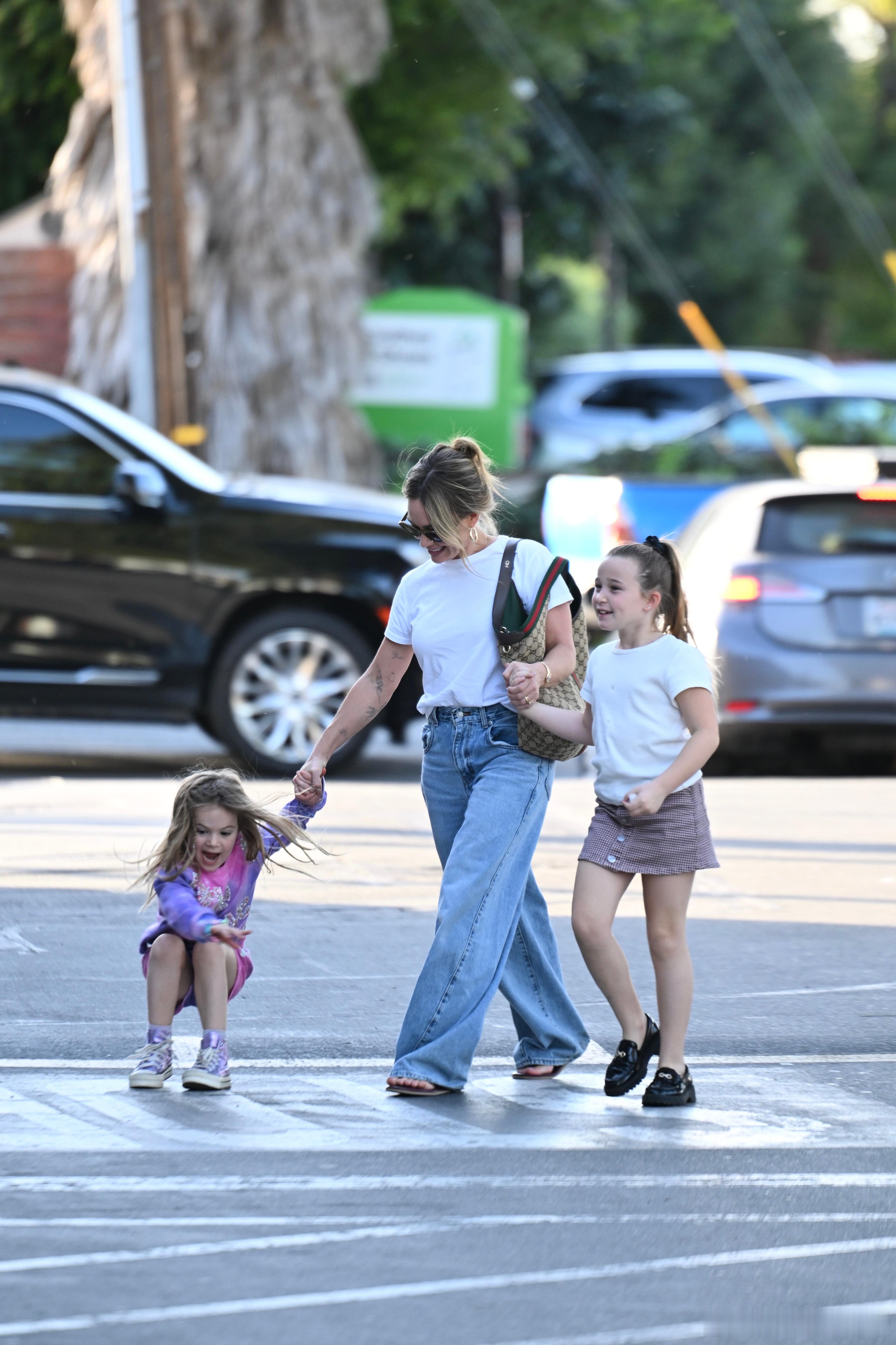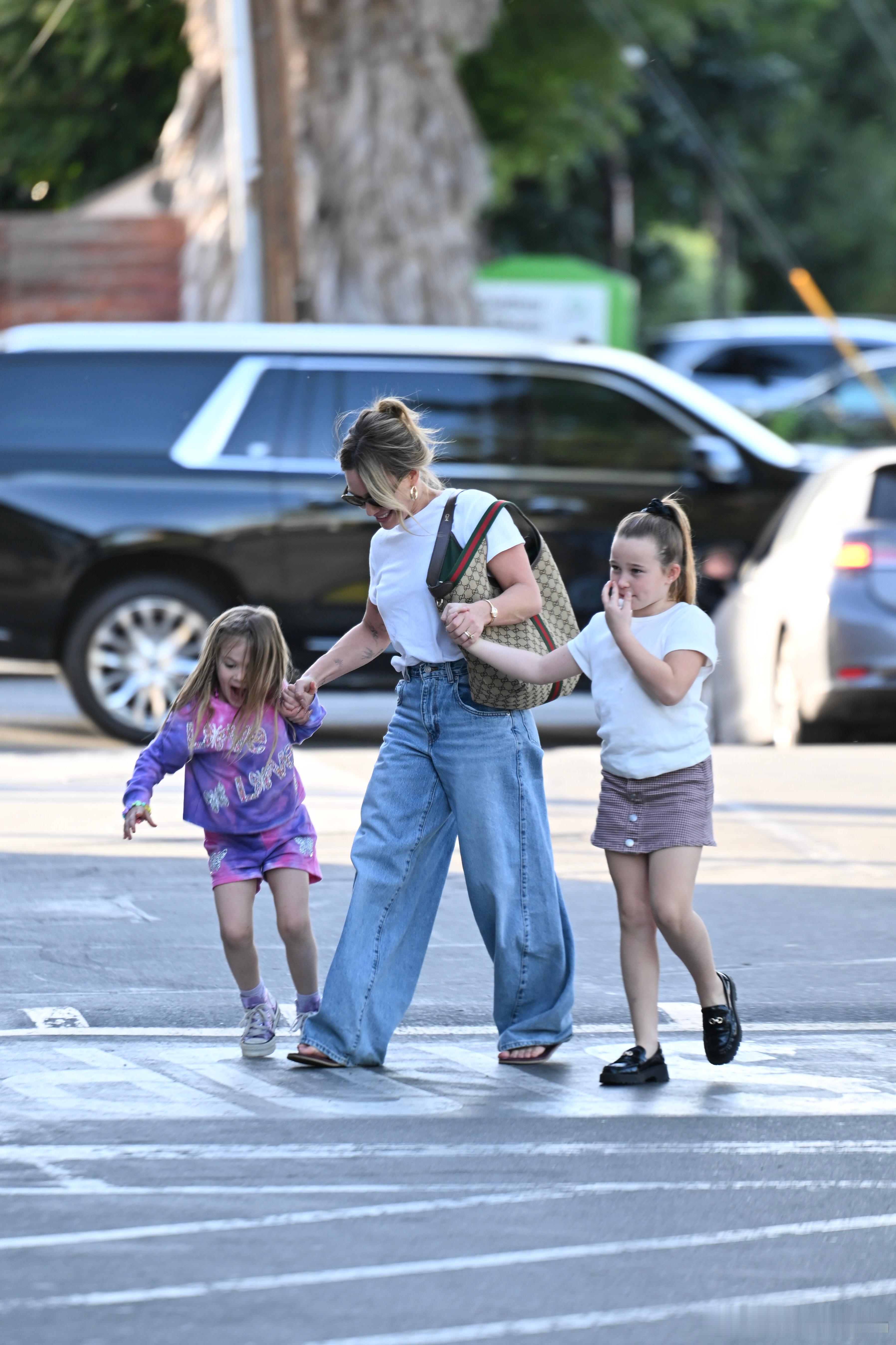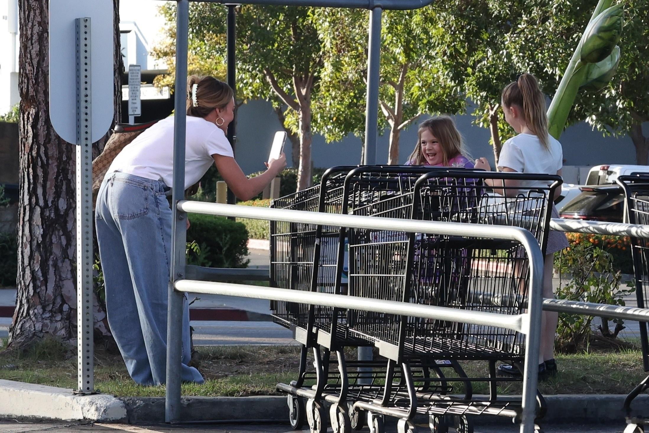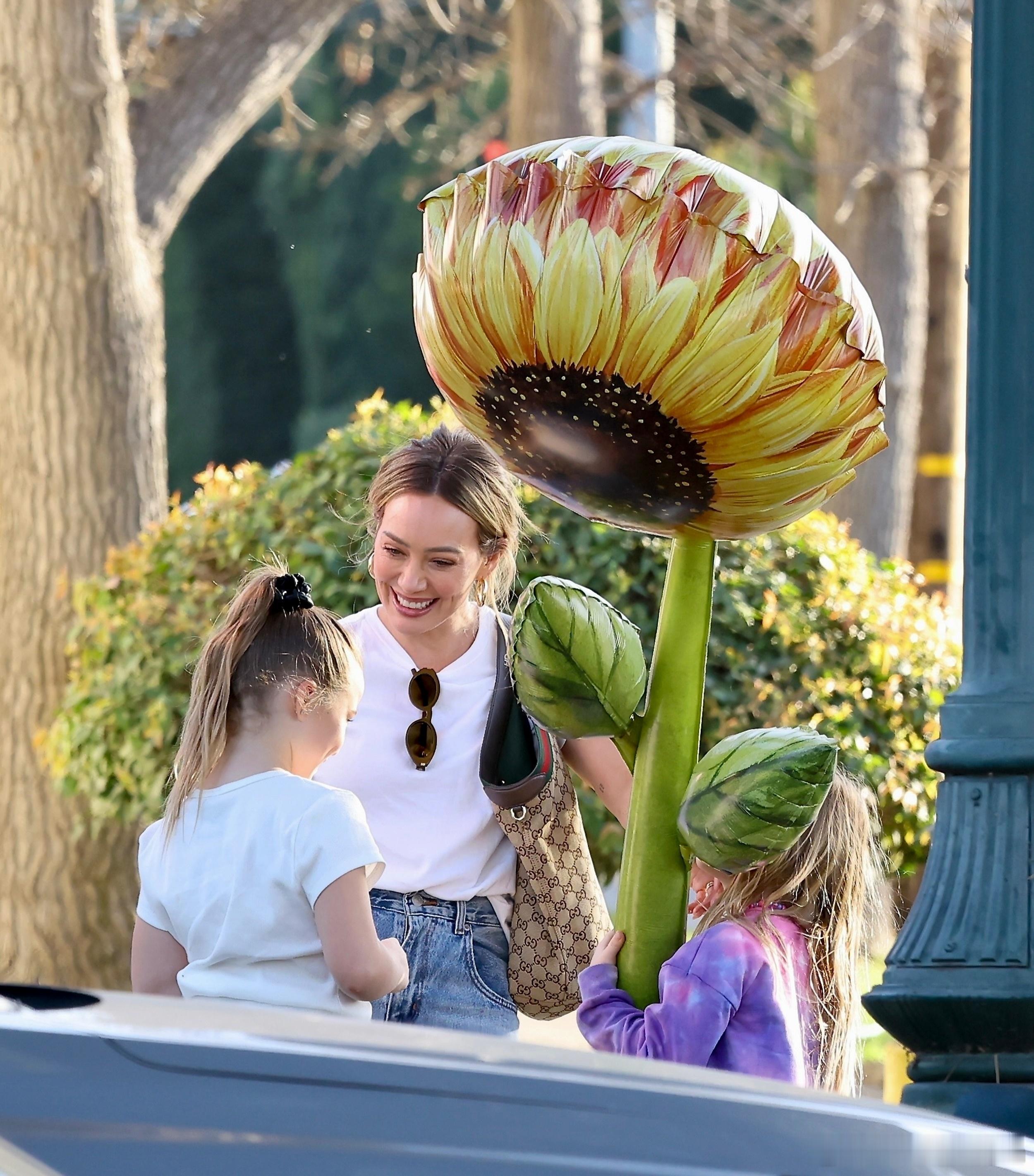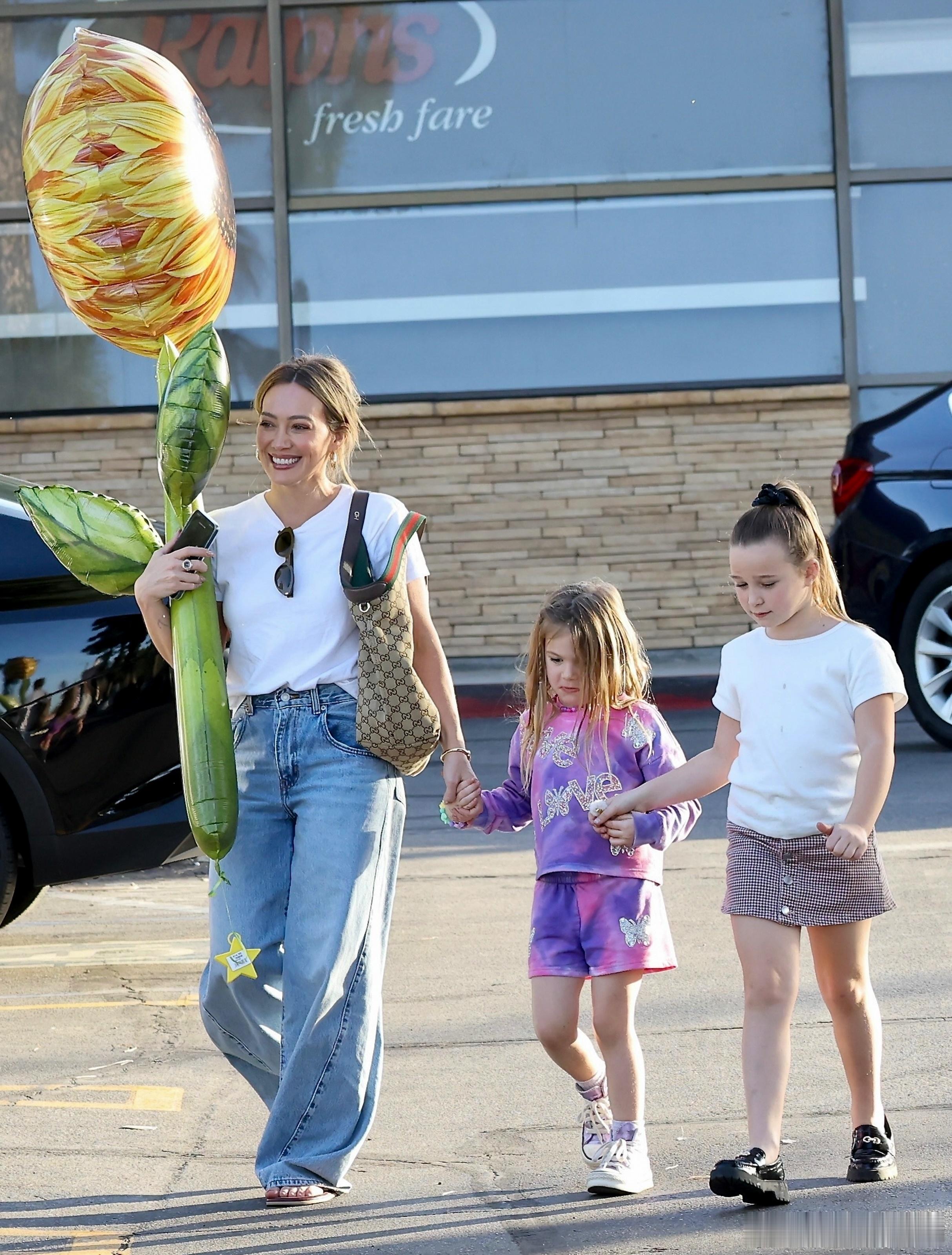 刚结束四场个人演出的Hilary duff希拉里达芙带着两个女儿Banks和Mae在洛杉矶外出,达芙和闺女们出门扫货,还买了一个巨型的向日葵气球