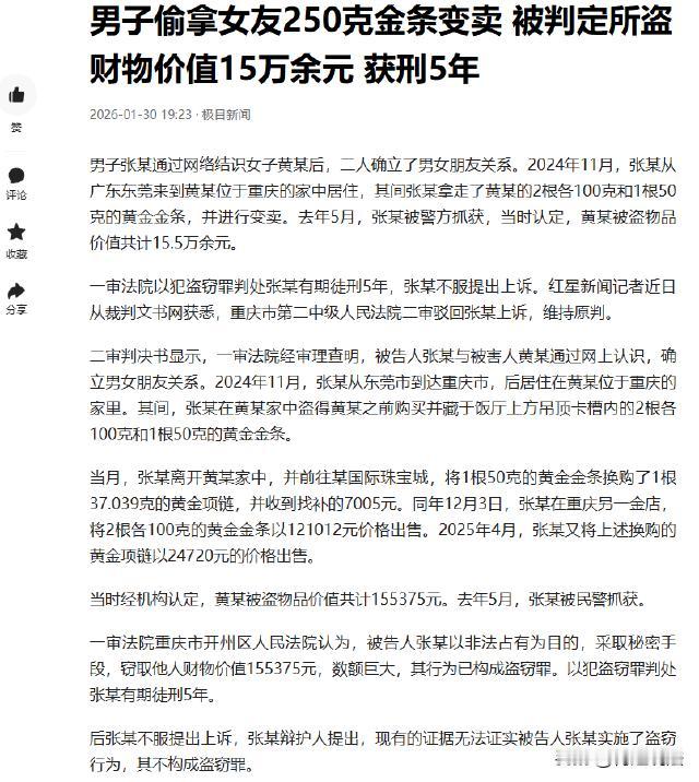 广东,一男子去重庆的女友家,离开时偷走女友250克黄金金条,卖了155000余元,5个月后男子被抓,因盗窃罪被判5年,他对判决不服,称没证据,最终还是被判了5年刑。网友调侃卖亏了,留到现在要翻倍。 2024年11月,广东的张某和重庆的黄女士,俩人在网上聊得火热,处上对象了,因为离得远,想得慌,张某就到重庆,住进了黄女士家。 刚住进去那阵,张某还挺老实,可有一次,他在饭厅打扫卫生,抬头瞅见吊顶卡槽里好像有东西,搬椅子踩上去一看,好家伙,是几根金条。 当月,张某瞅准黄女士出门的空,偷偷拿了3根金条,拿了一根50克的,跑去金店换项链,跟店员说想用金条换条项链,店员称完,给了条37克的,还补了他7005元,张某拿着项链和钱,觉得这钱来得太容易。 有了第一次,张某胆子更大了。 2024年12月3日,他又拿着剩下两根各100克的金条,去另一家金店,这家店老板有点经验,看着金条觉得不对劲,可张某一口咬定是自己合法所得,老板也没多问,121000余元就收下了。 几个月过去,黄女士压根没发现金条少了。她每天忙工作生活,哪能想到这茬,张某拿着偷来的钱,逍遥得不得了。 2025年4月,张某自己家金条不见了,他以为是遭贼了,赶紧报了警。 调查发现,张某之前卖金条的行为很可疑,走访金店时发现了张某卖金条的记录,而且金店登记的金条编号和黄女士买的一致。 这下,证据确凿,张某盗窃的事藏不住了,很快就被逮了起来。 被逮后,张某还不服气,说自己没偷金条,没有证据能证明,他觉得只要自己不承认,就拿他没办法,可法律哪能由的他瞎狡辩。 从法律上讲,盗窃罪是以非法占有为目的,盗窃公私财物数额较大,或者多次盗窃、入户盗窃等情况。 张某到女友家偷金条,属于入户盗窃,而且偷的金条价值高,数额巨大。 刑法规定,对案件判处要重证据、重调查研究,不轻信口供。只有被告人供述,没其他证据,不能定罪处罚;没被告人供述,证据确实充分,就能定罪处罚。 张某不承认偷金条,可金店有他卖金条的登记信息,金条编号和黄女士买的一样,这些证据形成完整链条,确实充分,就算他不承认,也能定他的罪。 有人疑惑,金店记录和金条编号为什么能当证据呢? 证据得有客观性、关联性和合法性。 金店记录客观存在,记录了张某卖金条情况。 金条编号和黄女士买的一致,就把张某和盗窃行为关联起来了。 而且收集证据过程合法,所以能当认定张某盗窃的证据。 张某偷金条,从情上说,他和黄女士是恋人,这么做太不地道,伤了黄女士感情。 从理上讲,偷东西不道德,违背公序良俗。 从法上说,他触犯刑法,必须受法律惩罚。 张某偷金条的行为,属于哪种盗窃情节呢? 他入户盗窃且数额巨大,按刑法规定,得处三年以上十年以下有期徒刑,并处罚金。 最后法院经审理认为,张某以非法占有为目的,盗窃他人财物,数额巨大,构成盗窃罪,最终判张某有期徒刑5年。 大家对这事怎么看呢?都来讨论讨论。