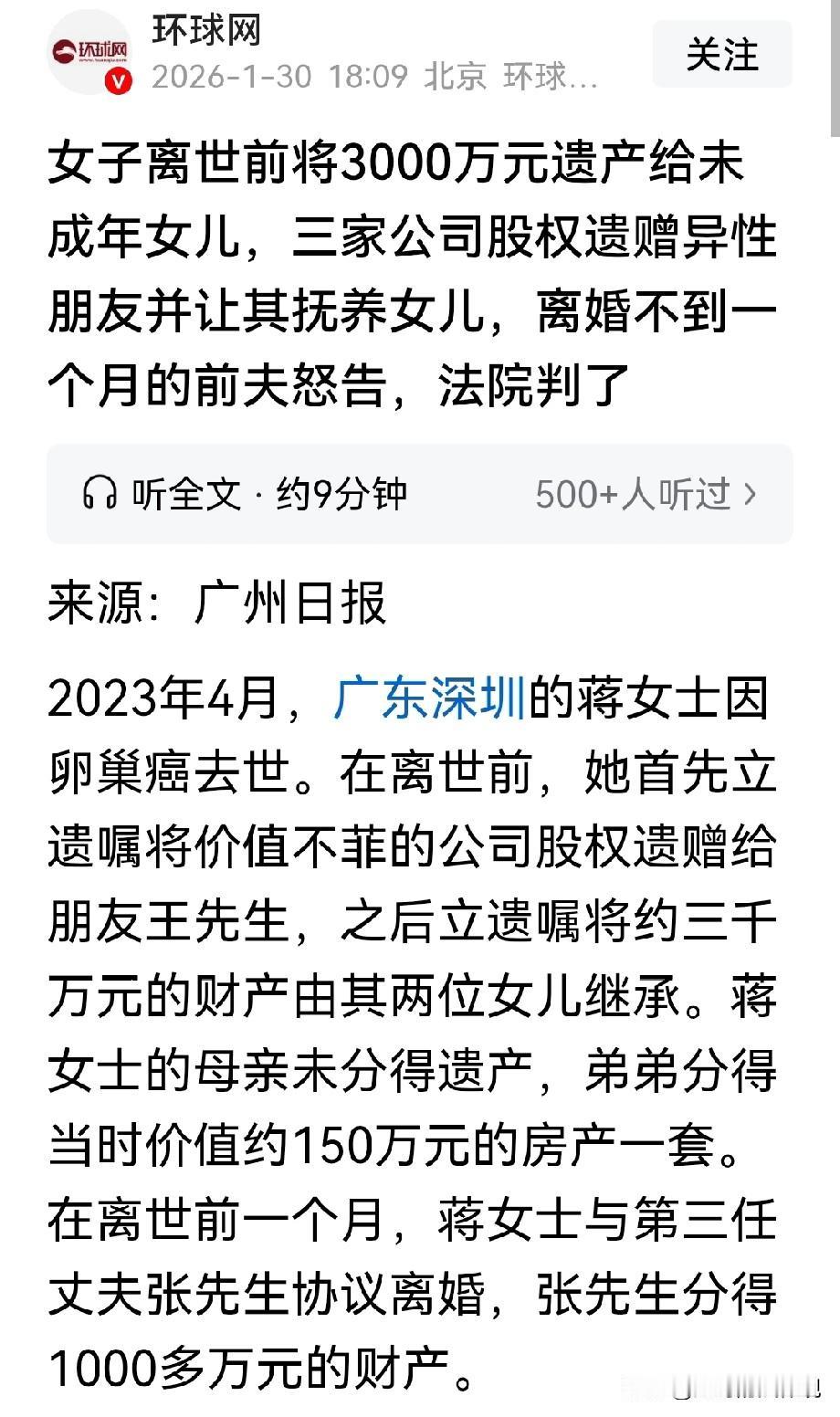 死无对证!广东深圳,42岁副教授和47岁,3婚女富豪结婚,并生育两个女儿。离婚不到一个月,前妻去世。两个女儿的监护权、以及3家公司给了自己的朋友,前妻母亲一分没有,亲弟弟只给一套房子。男子称,妻子患有精神疾病,遗嘱很不正常,他告上法庭,要求前妻朋友返还公司,交出女儿抚养权,判决结果,令他崩溃! 蒋女士离世前的第3任丈夫是张先生。 张先生是特聘副教授,2016年在国外与蒋女士相识相恋。 2017年,47岁的蒋女士和42岁的张先生结婚,婚后育有两个女儿。 这段婚姻只维持了6年多,妻子患有严重的精神疾病、抑郁症、焦虑症,患有卵巢癌。 2023年3月6日两人离婚,离婚协议明确,两个女儿由蒋女士直接抚养,张先生不用支付抚养费。 在财产分割上,蒋女士并没有亏待前夫。 她将自己名下深圳市的3套房产、惠州市1套房产归张先生所有。 另外,蒋女士还向张先生支付补偿款共计230万元,总价值1000多万元。 前妻去世后,张先生先后拿到了3套深圳房产和15万元现金。 前妻在与张先生离婚前,订立了多份公证遗嘱,张先生并不知道。 其中一份遗嘱写明:蒋女士把自己名下,深圳市某公司、广东某公司、独资的某设备公司的股权及相应权益,全部遗赠给合作了15年的朋友王先生。 王先生不仅是蒋女士的朋友,还是公司的负责人。 遗嘱字里行间,是对王先生的信任。 2023年3月5日,离婚前一天,蒋女士又订立了一份自书遗嘱。 指定朋友王先生为两个女儿的第一顺位监护人,自己的表妹黄女士为第二顺位监护人。 在蒋女士去世前几天,她又立下新遗嘱,指定王先生的妻子卢女士作为遗嘱执行人。 根据蒋女士的遗嘱,她把价值3000万元的多套深圳房产,和存款留给两个女儿继承。 不过,房产要等女儿22周岁才能继承,管理遗产人是朋友王先生的妻子卢女士。 除了房产,蒋女士在国内外还有存款760多万元,可她死后,海外账户竟然被盗,卢女士已报案。 张先生指控卢女士应对存款被盗负责,但他却拿不出证据证明,卢女士和账户被盗有关。 蒋女士所立遗嘱最大的疑点,是其他亲属的分配情况。 她没有留一分钱给自己亲生母亲。 亲弟弟,只分了一套,当时价值约150万元的重庆房产。 张先生觉得,遗嘱安排非常不合常理。 两个女儿是他与蒋女士亲生,却将监护权交到了王先生手中? 蒋女士曾患有精神疾病,他怀疑,前妻订立遗嘱时神志不清。 但蒋女士在遗嘱中注明了“本人书写本遗嘱时神志清醒,本遗嘱是我本人的真实意思表示”。 蒋女士去世几天后,两个女儿已交给张先生抚养了。 2023年4月28日,她在深圳市某公司的股权已变更登记到王先生名下。 广东某公司是深圳市某公司的全资子公司,而深圳市某设备有限公司现已注销。 2025年,张先生以自己和两个女儿的名义,把王先生和遗嘱第一执行人卢女士告上了法院。 要求两被告,把已登记到王先生名下的3家公司股权全部移交和过户给自己。 或者支付股权收益款380万元,还要求每月支付抚养费102500元,至两女儿22岁止。 每月支付3.8万元至按揭款付清止,每月支付监护风险成本2.2万元至18岁止。 在法庭上,张先生主张,蒋女士的遗赠是附义务遗赠,所附义务就是抚养两个未成年女儿至成年,并且尽到监护人义务。 他认为,遗嘱中的“希望”一词实质上是“恳切的要求”,具有法律上的约束力。 张先生认为,如果异性双方仅仅因同事关系,而没有情侣关系的巨额金钱财产的遗赠无附义务行为,不具有正当理由; 如基于情侣感情关系,既损害被继承人利益,又违反公序良俗。 而王先生和卢女士则辩称,张先生及两个未成年女儿,主张“遗赠附义务”无事实及法律依据。 公证遗嘱明确记载“无附加条件”,“希望照顾子女”仅为情感寄托,不构成法律义务。 遗嘱内容相互独立,没有抵触和因果关系。 张先生及孩子们主张“结合为遗赠扶养协议”无法律依据,遗嘱也不违反公序良俗。 蒋女士通过公证遗嘱处分个人财产,符合遗嘱自由原则,且未侵害未成年人必要遗产份额。 法院经审理认为,这是遗赠纠纷。 依据《民法典》第1144条,遗嘱继承或者遗赠附有义务的,继承人或者受遗赠人应当履行义务。 蒋女士在遗嘱中表述的“希望”王先生照顾其女儿,并非对接受遗赠设定的条件和义务。 蒋女士在遗嘱中将王先生指定为监护人时,“完全未提及遗赠的相关内容”。 所以两份遗嘱相互独立,不存在附义务遗赠的情形。 最终,法院驳回了张先生及两个女儿的诉讼请求,案件受理费73400元由原告承担。 此外,法院另一份判决也驳回了,张先生撤销卢女士遗嘱执行人和遗产管理人资格的主张。 认定蒋女士的遗嘱真实有效。 同时也认定张先生是两个女儿的监护人、法定代理人,支持惠州房产过户给张先生,并支付部分款项给张先生。