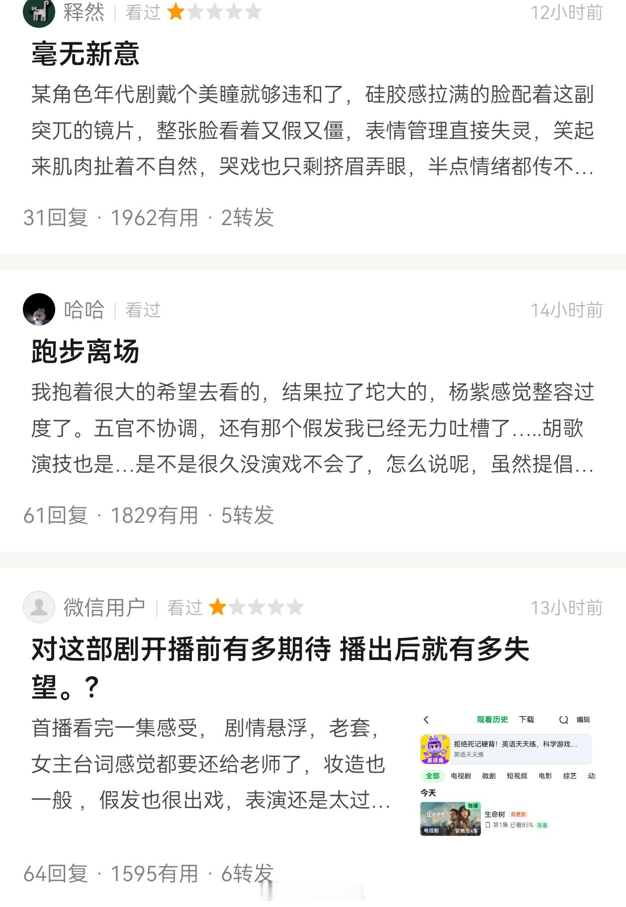 为啥杨紫胡歌《生命树》的评分有这么多1星