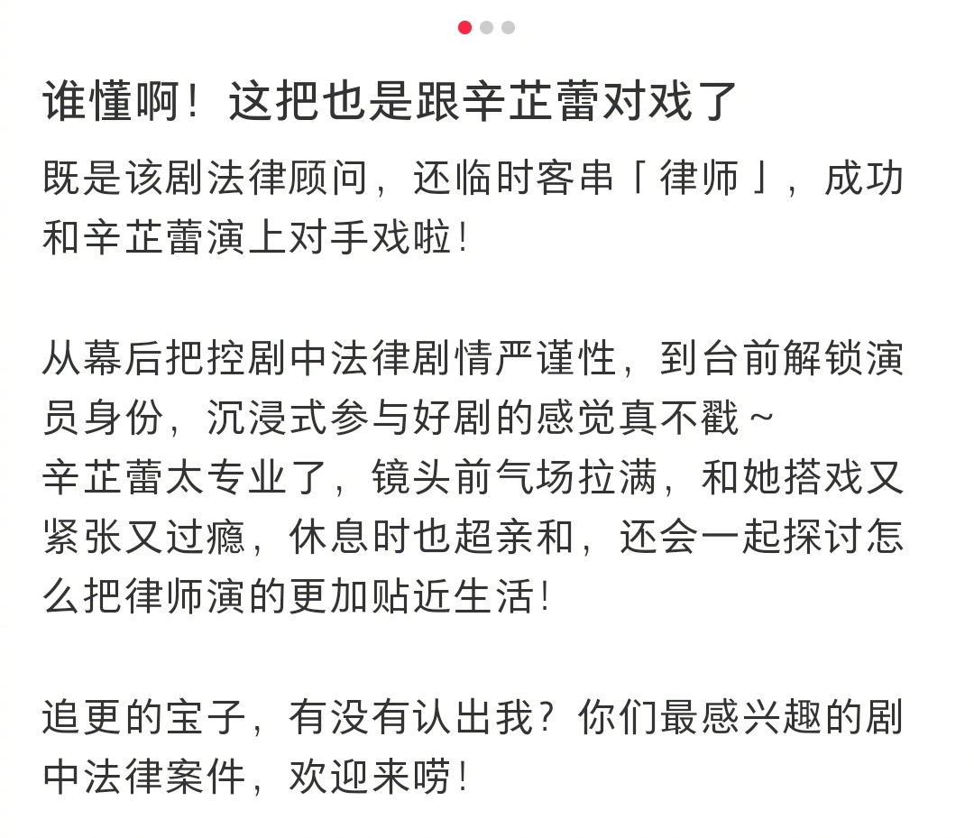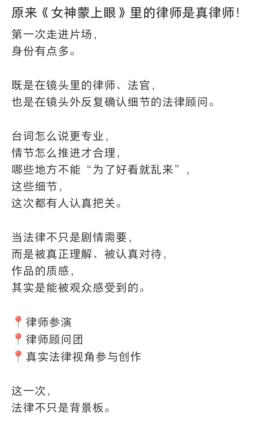 #女神蒙上眼的律师是真律师客串##律师说和辛芷蕾搭戏又紧张又过瘾#原来《女神蒙上眼》剧里是有真律师客串的,剧组把控细节真的好严谨👍🏻!有律师还分享了和辛芷蕾的搭戏感受,说辛芷蕾太专业了,镜头前气场拉满,和她搭戏又紧张又刺激~#女神蒙上眼#