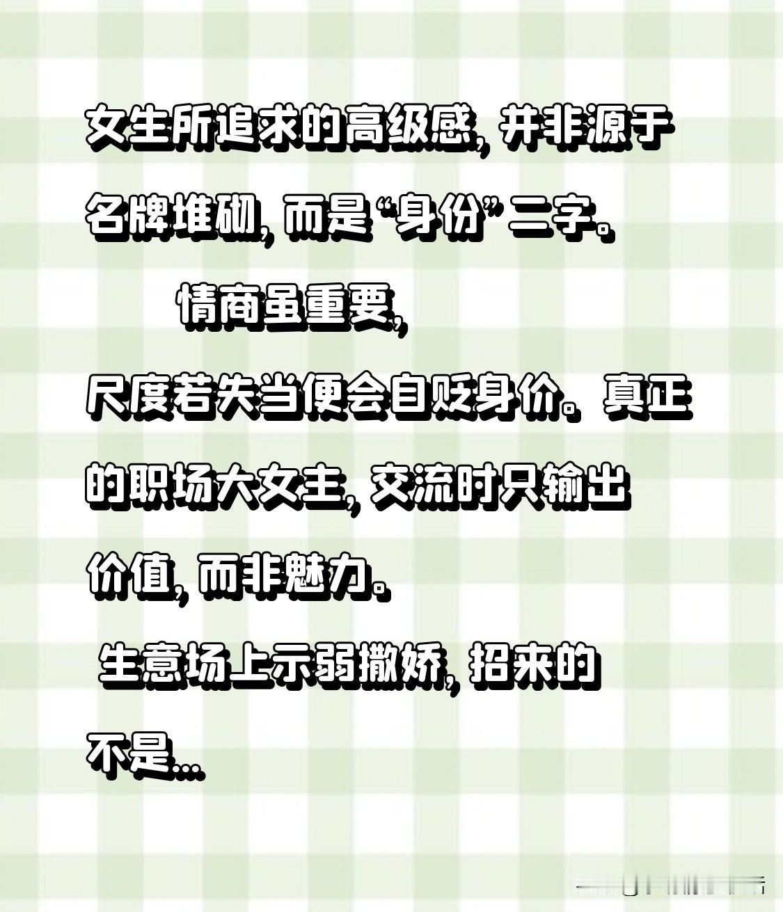 女生所追求的高级感,并非源于名牌堆砌,而是“身份”二字。 情商虽重要,尺度若失当便会自贬身价。真正的职场大女主,交流时只输出价值,而非魅力。 生意场上示弱撒娇,招来的不是关照而是冒犯;老板过于随和,换来的是威严尽失。 无论咨询师还是销售,守住专业界限,营造“我主你客”的优势,才能让人敬畏你的身份,认可你的价格。 你是“讨好型”还是“高冷型”?评论区分享职场心得。点赞收藏,活出高级身份感! 女性应有的气质 最高的气质状态
