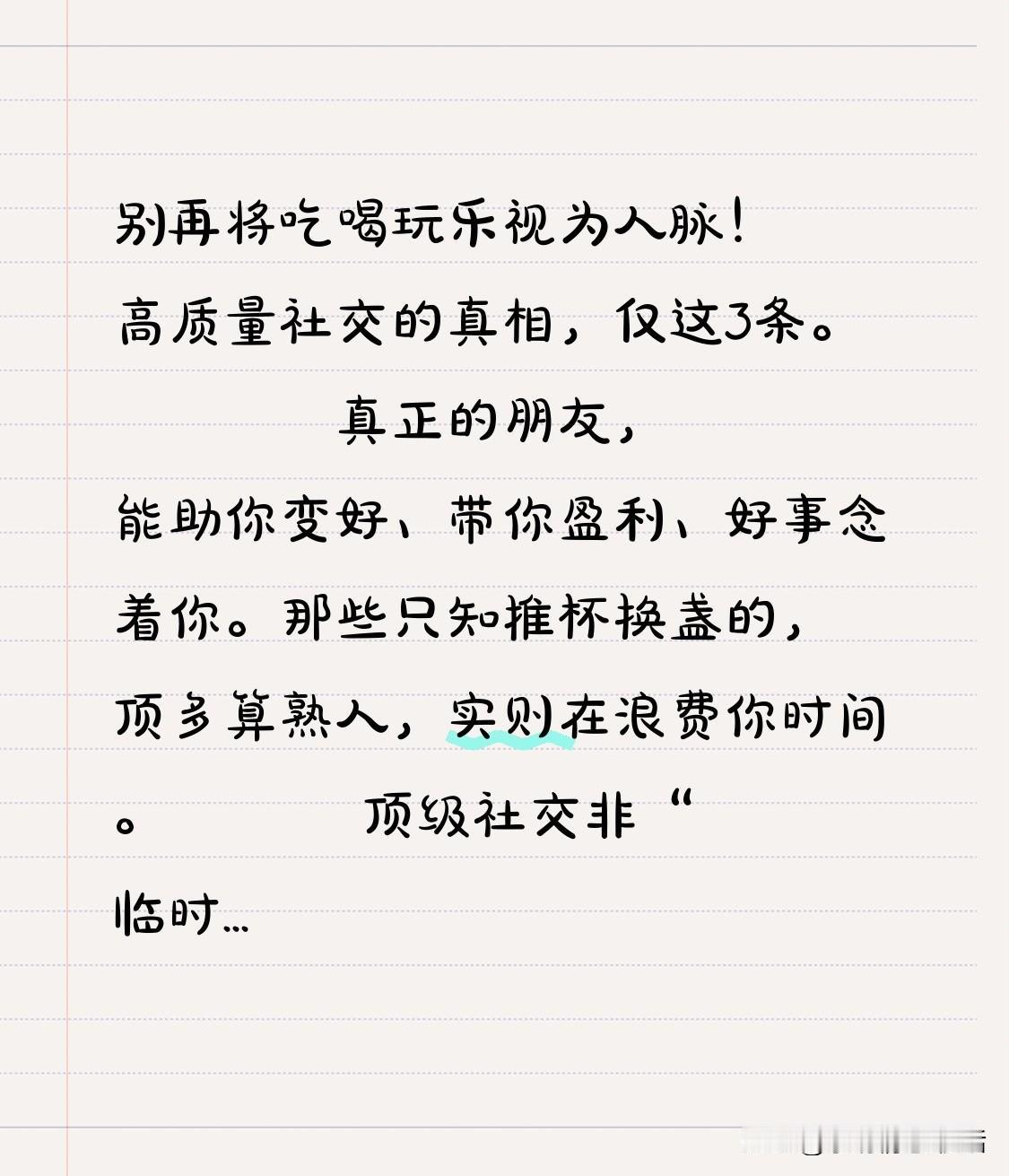 别再将吃喝玩乐视为人脉!高质量社交的真相,仅这3条。 真正的朋友,能助你变好、带你盈利、好事念着你。那些只知推杯换盏的,顶多算熟人,实则在浪费你时间。 顶级社交非“临时抱佛脚”,而是日常积攒“人情积分”。 高段位者发心纯粹、处事利他,于细节维护关系,而非有事才找人。 你的人脉有多少“有效连接”?评论区分享你的故事。点赞收藏,学做社交智者。 人性社交法则 人际社交圈 饭局社交技巧