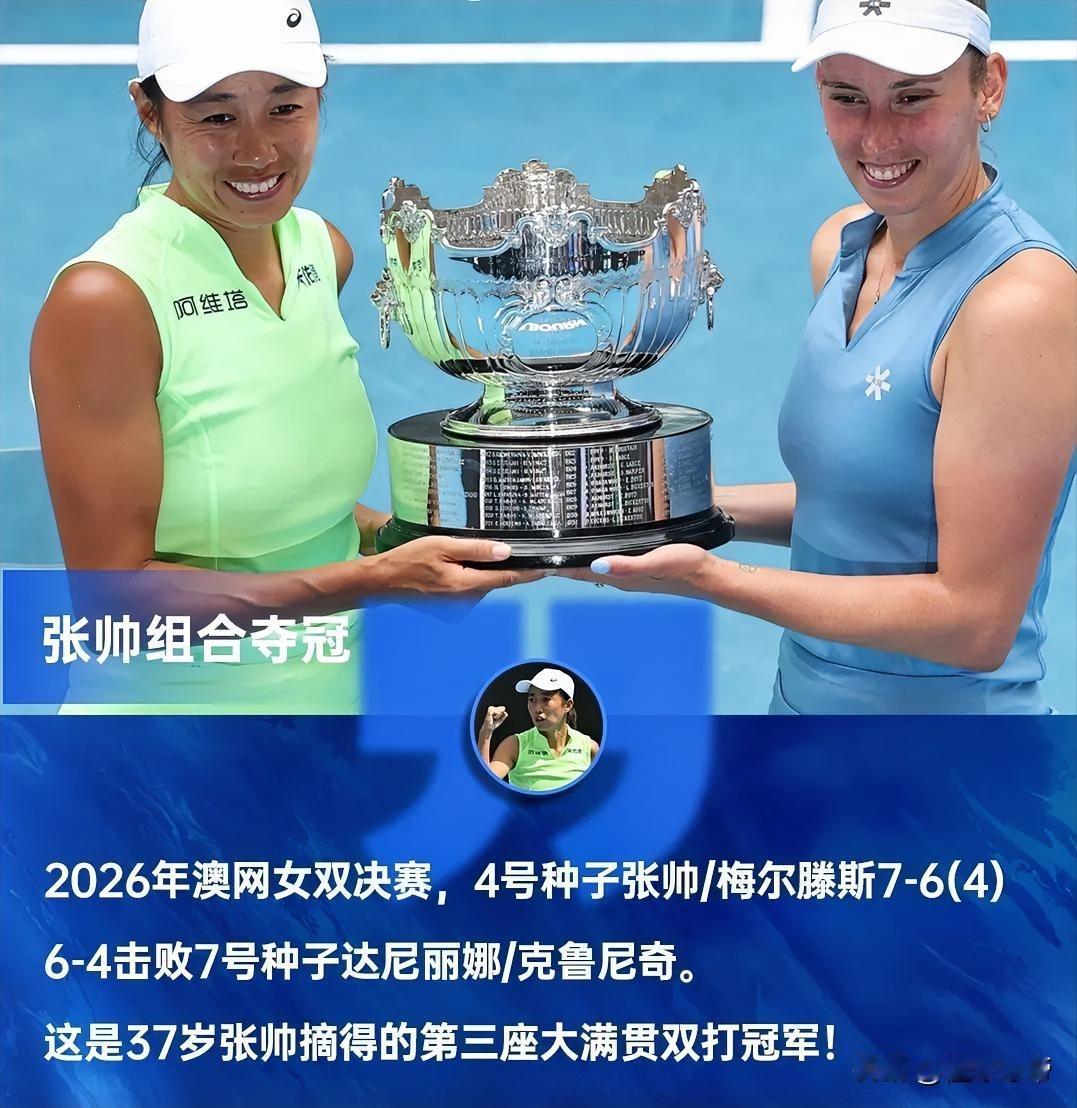 亚洲女子网球双打第一人,37岁的张帅拿到澳网女双冠军! 在今天上午进行的澳网女双决赛中,4号种子张帅+梅尔滕斯的组合2-0战胜了7号种子达尼丽娜+克鲁尼奇组合,捧起了大满贯女双冠军奖杯,收货了81万澳元奖金,张帅能平分到约146万元人民币。 本赛季37岁张帅给自己设立的目标就是拿澳网女双冠军,功夫不负有心人终于实现了目标。37岁的张帅职业生涯已经拿到了3座大满贯双打冠军了,绝对是亚洲女子网球双打第一人。 昨天37岁的德约科维奇闯进了澳网男单决赛,今天37岁的张帅拿到了澳网女双冠军,都是不老的传奇。
