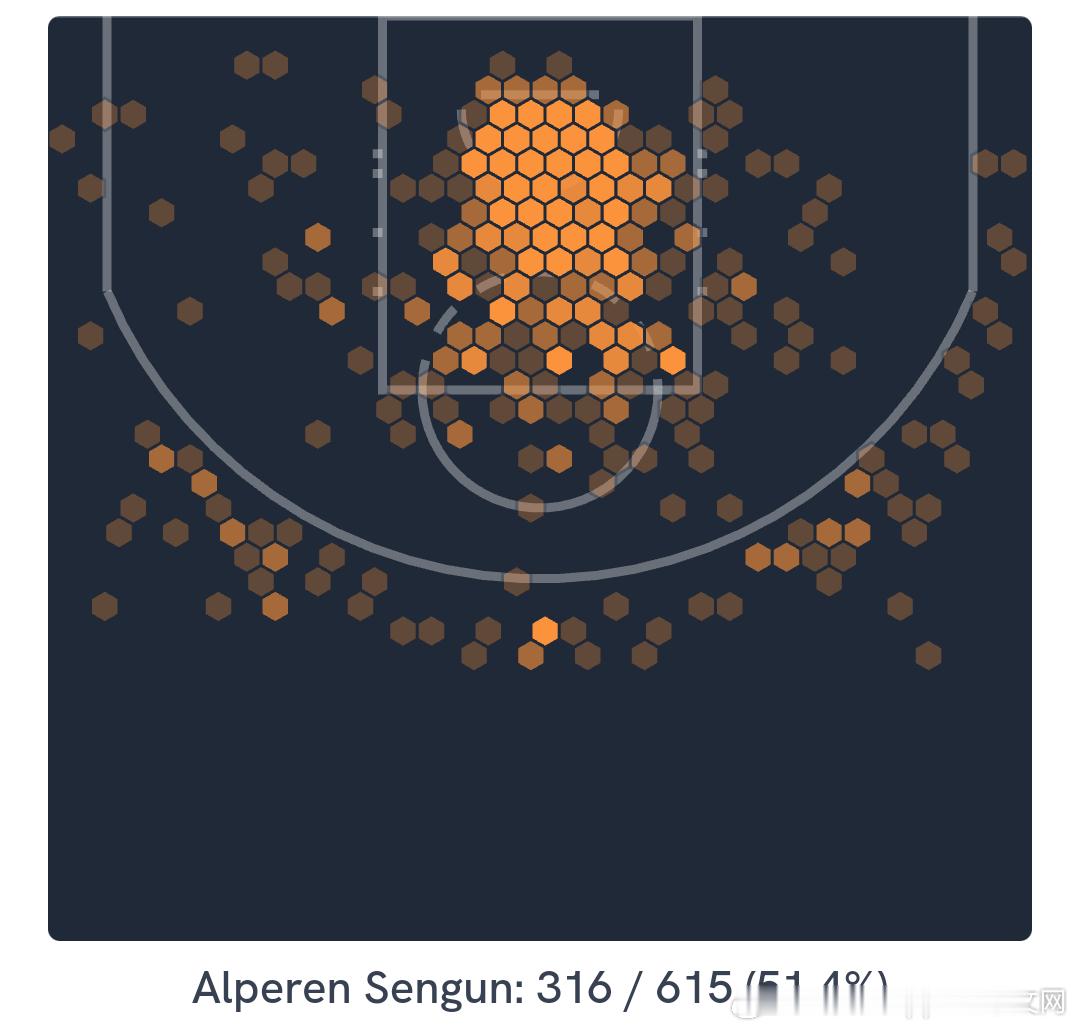 申京则几乎相反:他的中远距离投射相对吃力,但近框效率优秀(如图8)。更关键的是,申京在三分线内的主要出手区域,和谢泼德的三分线内有效出手点存在高度重合——这会让两人同时在场时的空间与回合分配变得更拧巴。