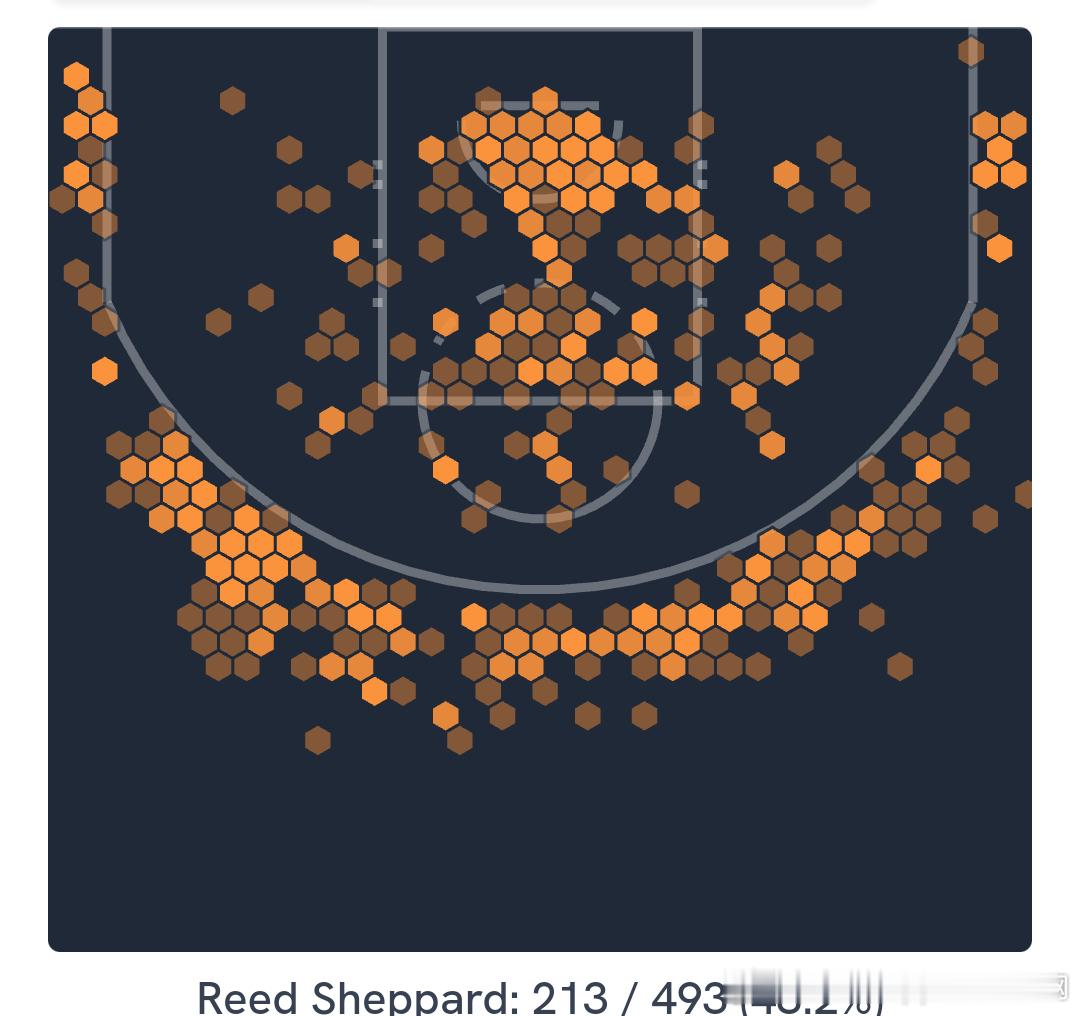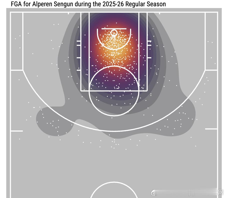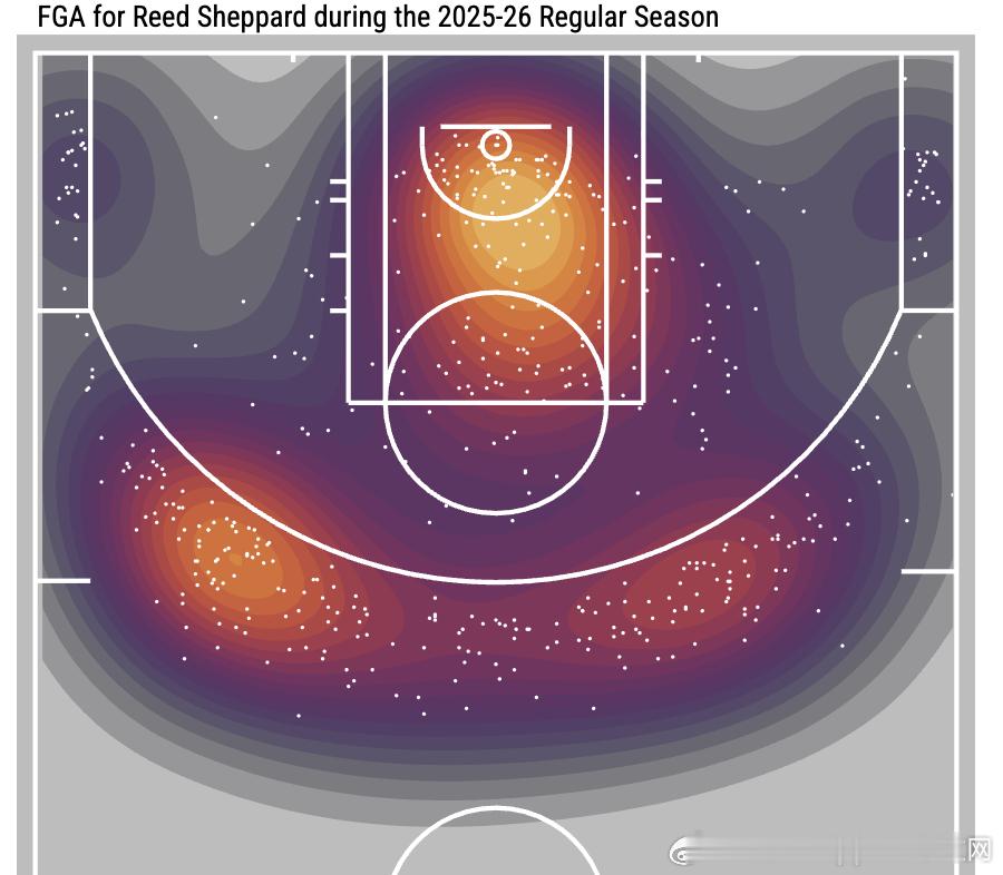 只是从数据与打法出发,短期内我并不太看好两人的配合。1)进攻端:出手区域重叠,但优势区间不太互补谢泼德出手分布(图1)申京出手分布(图2)进攻重合区域(图3修改后。更直观的,可以看峰值对比图6)(为了更清晰的从投射热图来看我们做了进一步的对比,图4是谢泼德的出手热图,图5是申京的,可以看到谢泼德的中距离出手习惯和申京的低位持球进攻确实有一部分重合)(两个人的出手习惯和频率参考,谢泼德图7,申京图8)