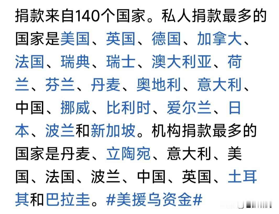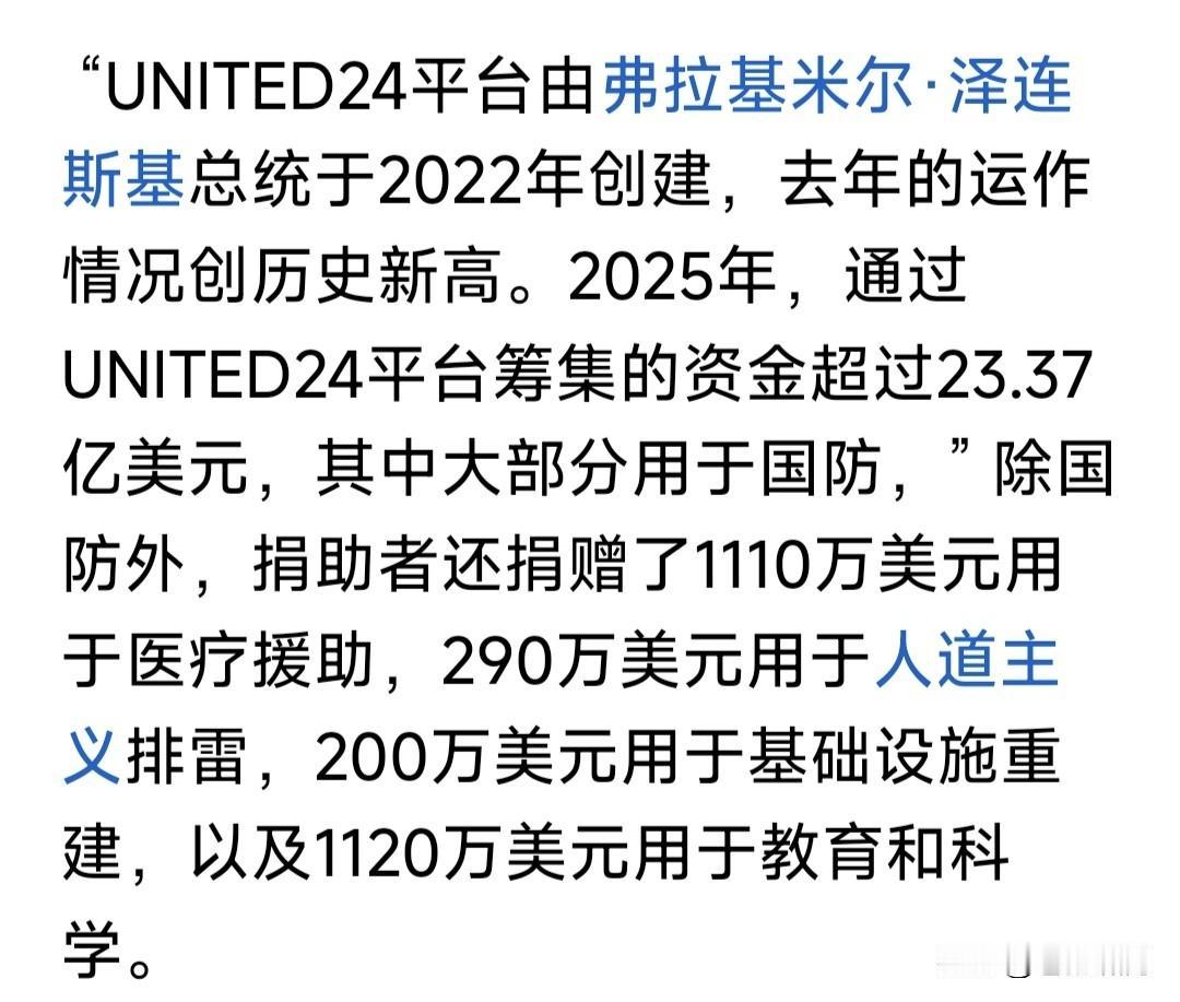 乌公布2025年各国非政府捐助款,共计23.37亿美元,分别来自140个国家和地区的私人与机构捐款。 这个捐款平台由泽连斯基创建,已运行三年时间。捐款数量逐年增加,2025年达到最高数额。捐款主要用于国防,兼顾科研教育人道救援等。 看捐款国家名单,主要是北约欧盟G7与“自愿联盟”等发达国家!令人欣慰的是,中国名字赫然在列,说明我们中有许多个人与机构都捐了款! 这个140个国家的数字,也同联合国数次通过决议,敦促发动战争者撤军,投赞同票国家数量相符。说明世界自有正义在,多数国家都遵守联合国宪章,反侵略反恐怖,向往和平啊! …………