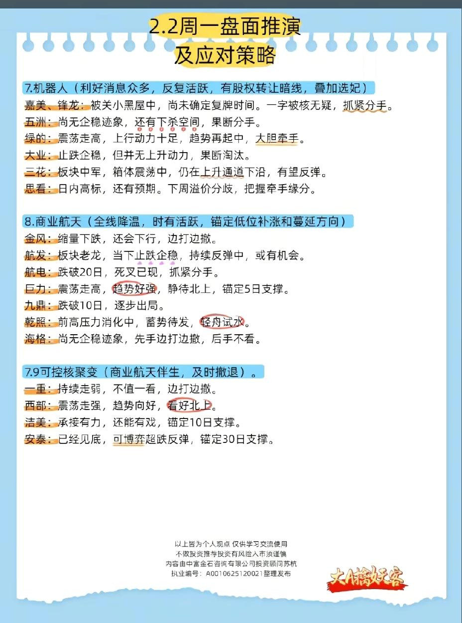 2月2日,周一A股这些板块值得重点关注!!! 农业板块:YH文件往年在春节前后公布,相关农业概念股值得关注;白酒饮料板块:每年春节前必炒板块,但持续性一般;存储芯片板块:涨价逻辑叠加利好,后市值得高看一眼;AI板块:今年的核心板块,上方空间大,后市值得高看一眼;人形机器人板块:个人认为二月最有可能大爆发的板块,消息发酵,叠加利好,后市可期。 二月重点关注AI和人形机器人板块!!!