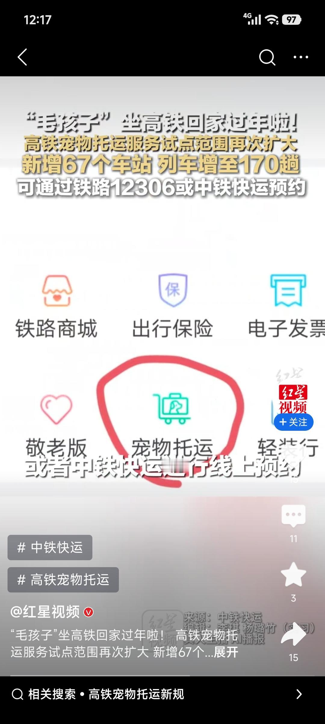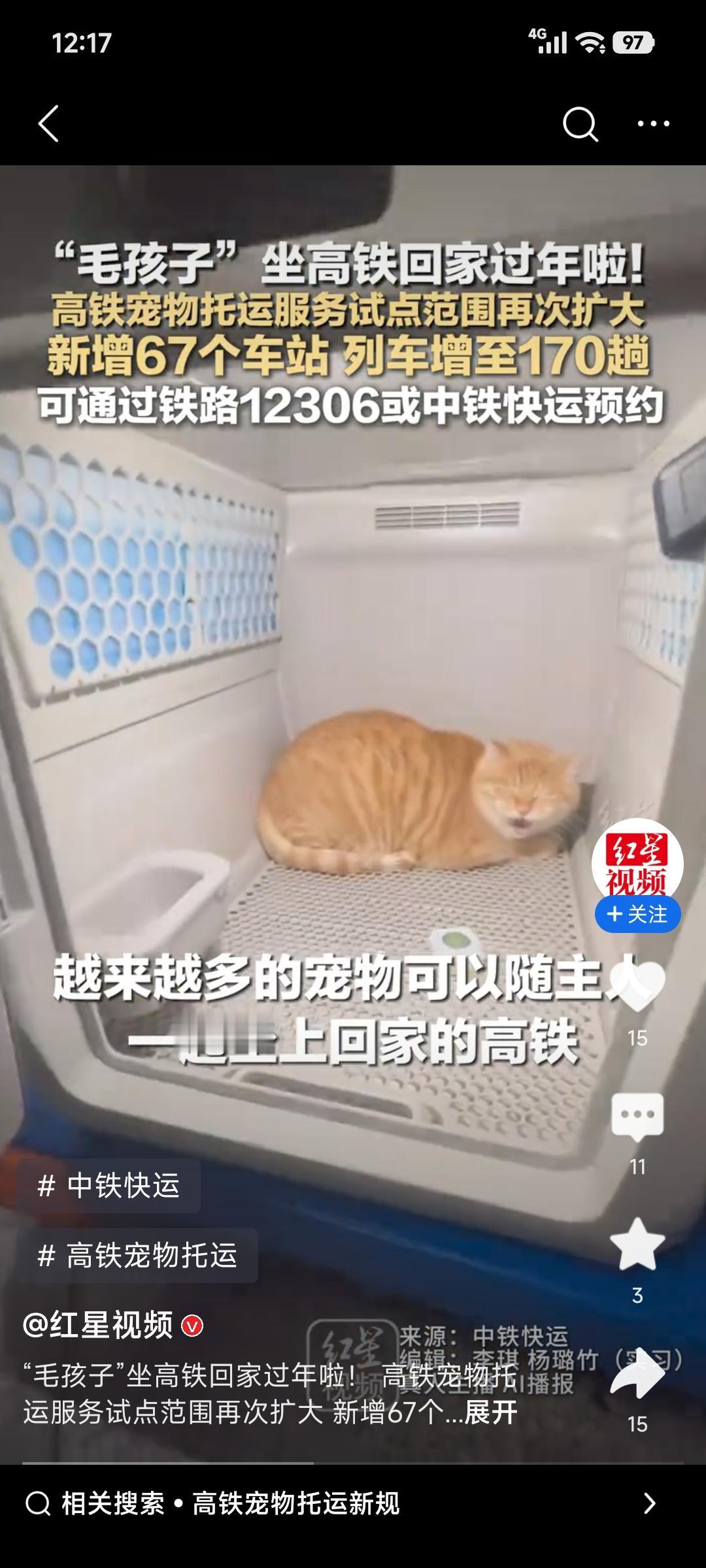今年春节“毛孩子”也能坐高铁回家啦!1月28日起,铁路部门第四次扩大高铁宠物托运服务试点范围,办理业务的高铁站达110个,高铁列车由54趟增至170趟。 预约方式有两种。购票旅客可用12306客户端“宠物托运”功能,12时前约次日仓位,12时(含)后约第三日,最多可托运2只;非购票旅客提前2 - 5天在“中铁快运”小程序下单,最多托运1只。 托运时要提前准备证件和证明,开车前2小时去高铁站办理。到站后铁路会通知接宠。像哈尔滨的王女士,以前自驾12小时带猫回家,现在高铁2小时就行。这个春节,“毛孩子”也能轻松团圆!
